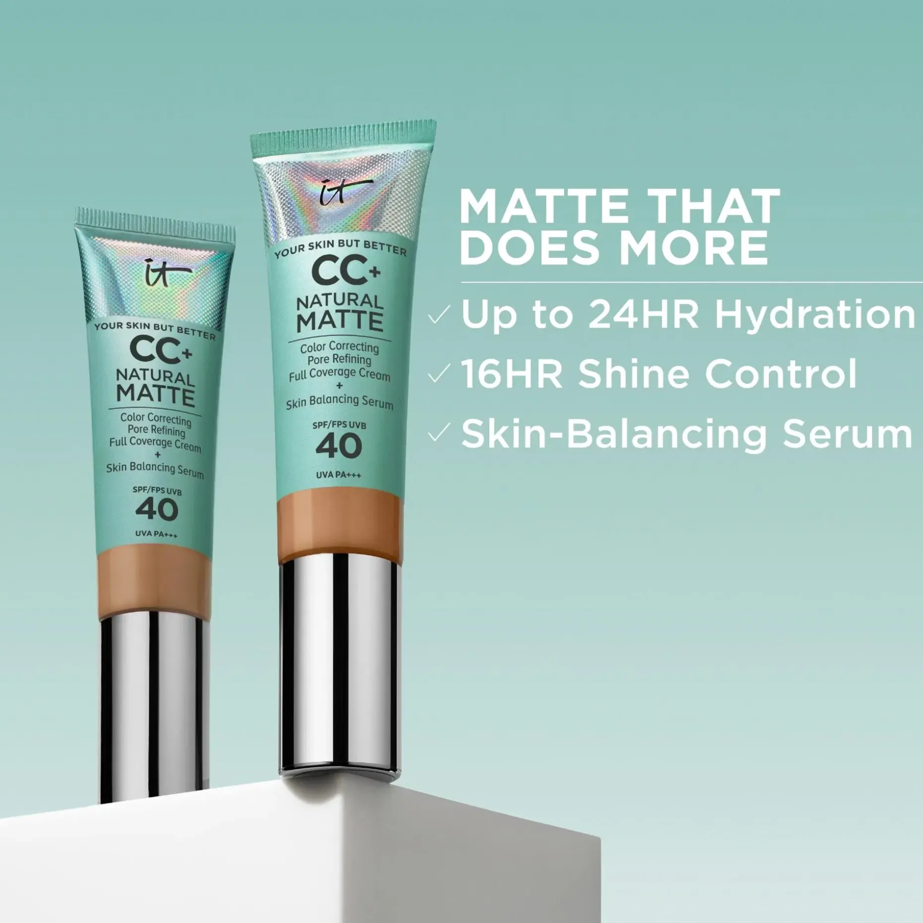 Rasvoittuva iho? Loihdi ihosta mattapintainen CC+ Cream Natural Matte meikkivoiteella – kiiltoa vähentävä, täysin peittävä meikkivoide sekä ihoa tasapainottava seerumi ja suojakerroin SPF40 samassa tuotteessa.