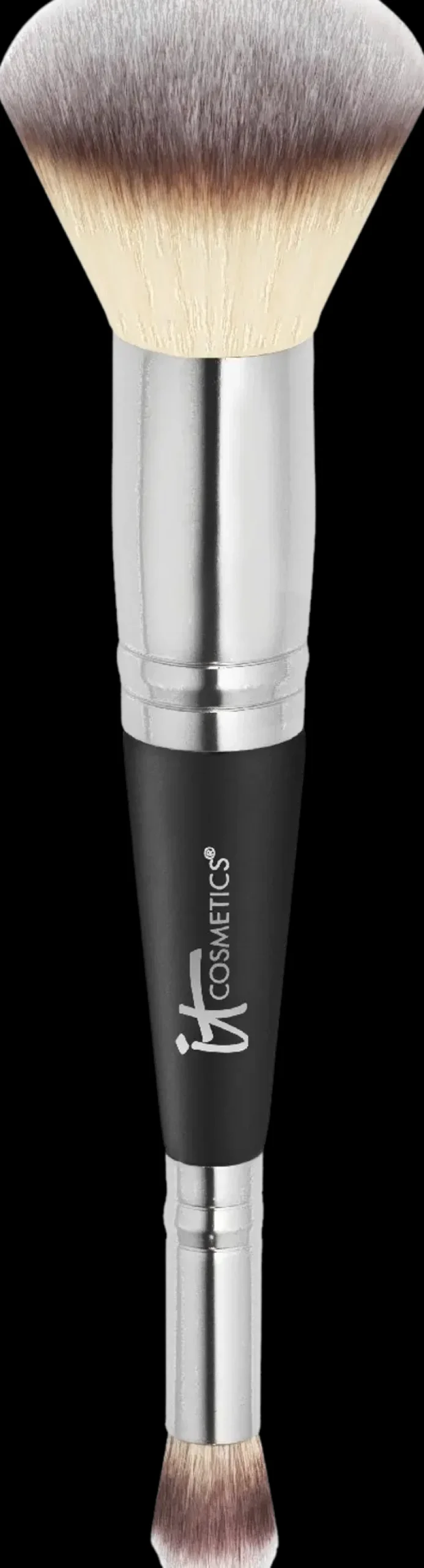 IT Cosmetics Heavenly Luxe™ Complexion Perfection Brush #7. 2-in-1 siveltimen toisessä päässä on meikkivoidesivellin ja toisessa peitevoidesivellin. Pyöreäpäisillä siveltimillä meikkivoide ja peiteaine häivyttyvät kasvoille kauniisti. Ylellisen ja palkitun siveltimen harjakset eivät irtoile ja siveltimen varsi on ergonomisesti muotoiltu. Lisäät meikkivoiteen kasvoille helposti suuremmalla siveltimellä ja peität näkyvistä ihon pienet virheet pienemmällä siveltimellä.