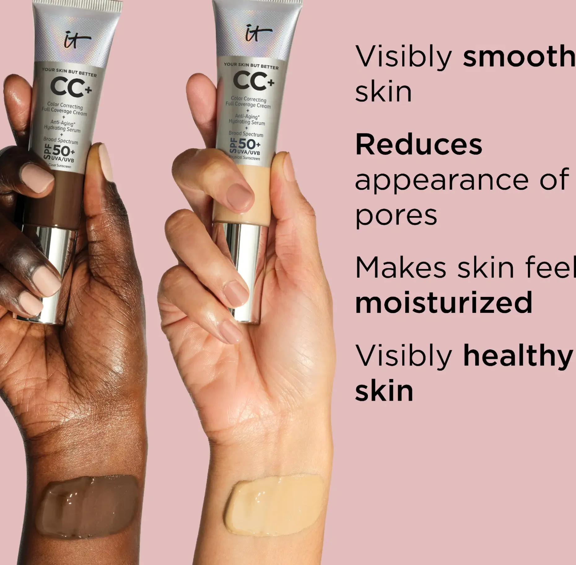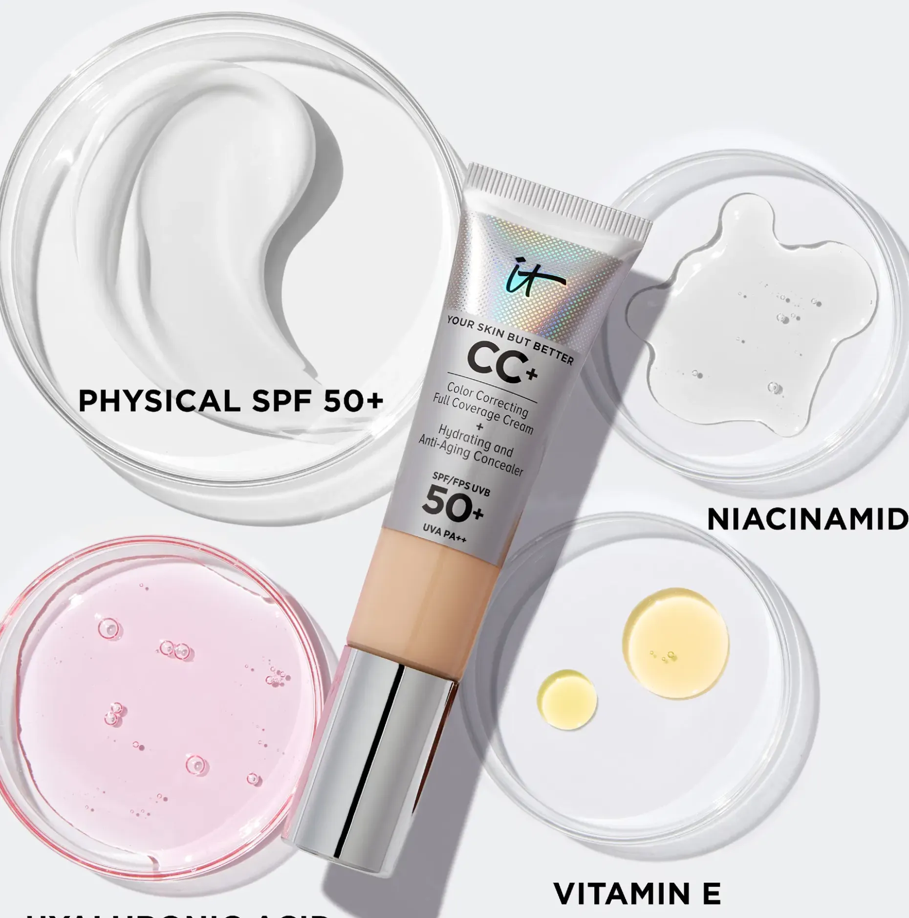 IT Cosmeticsin CC+ Cream on kehitetty yhteistyössä plastiikkakirurgien ja ihotautilääkäreiden kanssa. Se takaa, että tuote sisältää iholle hyödyllisiä ja hellävaraisia ainesosia.