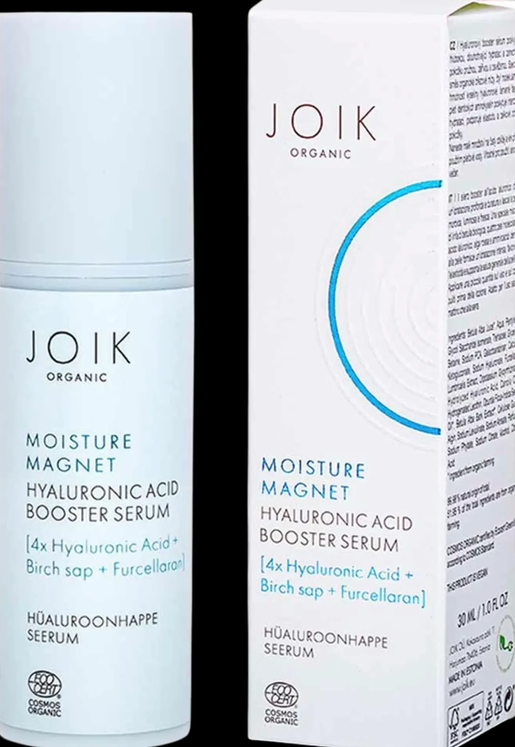 JOIK Moisture Magnet Hyaluronic Acid Booster Kasvoseerumi sisältää kosteuttavaa monimolekyylipitoista hyaluronihappoa joka estää kosteuden haihtumisen iholta. Koivunmahla, punaleväuute sekä ihoa jäljittelevät aminohapot ja hiilihydraatti kompleksi tekevät ihosta kimmoisamman jättäen ihon kuulaan raikkaaksi.