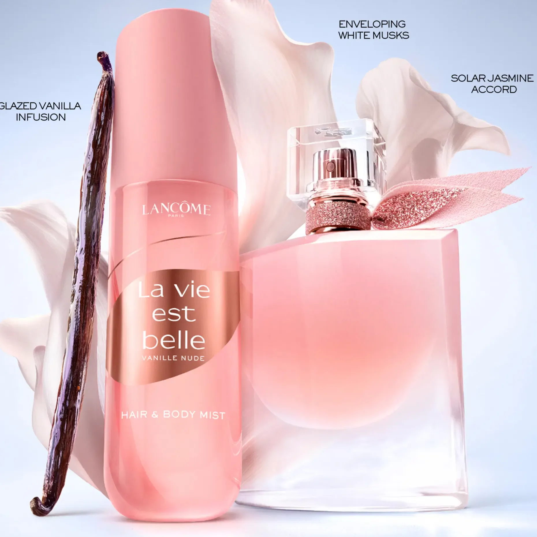 Lancôme La Vie Est Belle Vanille Nude -hius- ja vartalosuihke tarjoaa virkistävän ylellisen tavan nauttia gourmand-tuoksusta. Alkuperäisestä Eau de Parfumista inspiraationsa saanut kevyt suihke on tehty hiuksille, iholle tai vaatteisiin päivittäiseen käyttöön sekä mukaan otettavaksi. Tuoksu avautuu vaniljalla tarjoten herkullista ja lohdullista makeutta. Ytimessä aurinkoinen jasmiininsävy luo säteilevää kukkaista naisellisuutta, kun taas pohjalla olevat valkoiset myskit lisäävät pehmeyttä, lämpöä ja puuterimaista aistillisuutta. Tuloksena on iloinen, koukuttava tuoksu, joka tuntuu sekä säteilevältä että lohdulliselta. Kevyt ja monikäyttöinen suihke sopii tuoksun raikastamiseen päivän aikana tai kerrostettavaksi muiden tuoksujen kanssa. Leikkisä ja elegantti pullo on suunniteltu kulkemaan mukana kaikkialle ja tuomaan miellyttävän tuoksuhetken aina haluttaessa. • Monipuolinen: sopii hiuksille, iholle ja vaatteille. • Kevyt koostumus: raikastava suihke sopii käytettäväksi uudelleen päivän aikana. • Iloa tuova tuoksurituaali: leikkisä tuoksuelämys, joka kohottaa mielialaa. • Pitkäkestoinen raikkaus: virkistää hiukset ja vartalon pehmeällä tuoksulla. • Vaniljasävy: vanilja tuo tuoksuun pehmeää ja miellyttävää makeutta.