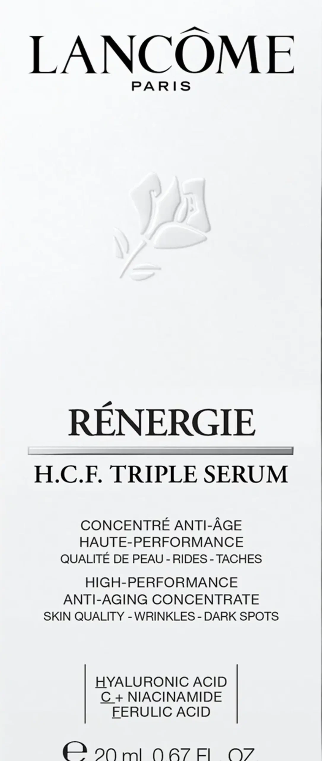 Lancômen Rénergie H.C.F. Triple Serum mullistaa anti-age-ihonhoidon. Innovatiivinen seerumi on patentoitu vuoteen 2035 asti. Sen kolme tehokasta ainesosaa yhdistyvät annokseksi: hyaluronihappo, C-vitamiini + niasiiniamidi ja ferulahappo. Nämä ainesosat toimivat täydelliseesti yhdessä iholla: Ne kosteuttavat tehokkaasti, häivyttävät näkyviä ryppyjä ja pigmenttiläiskiä ja kiinteyttävät ihoa tehden siitä nuorekkaamman näköisen.