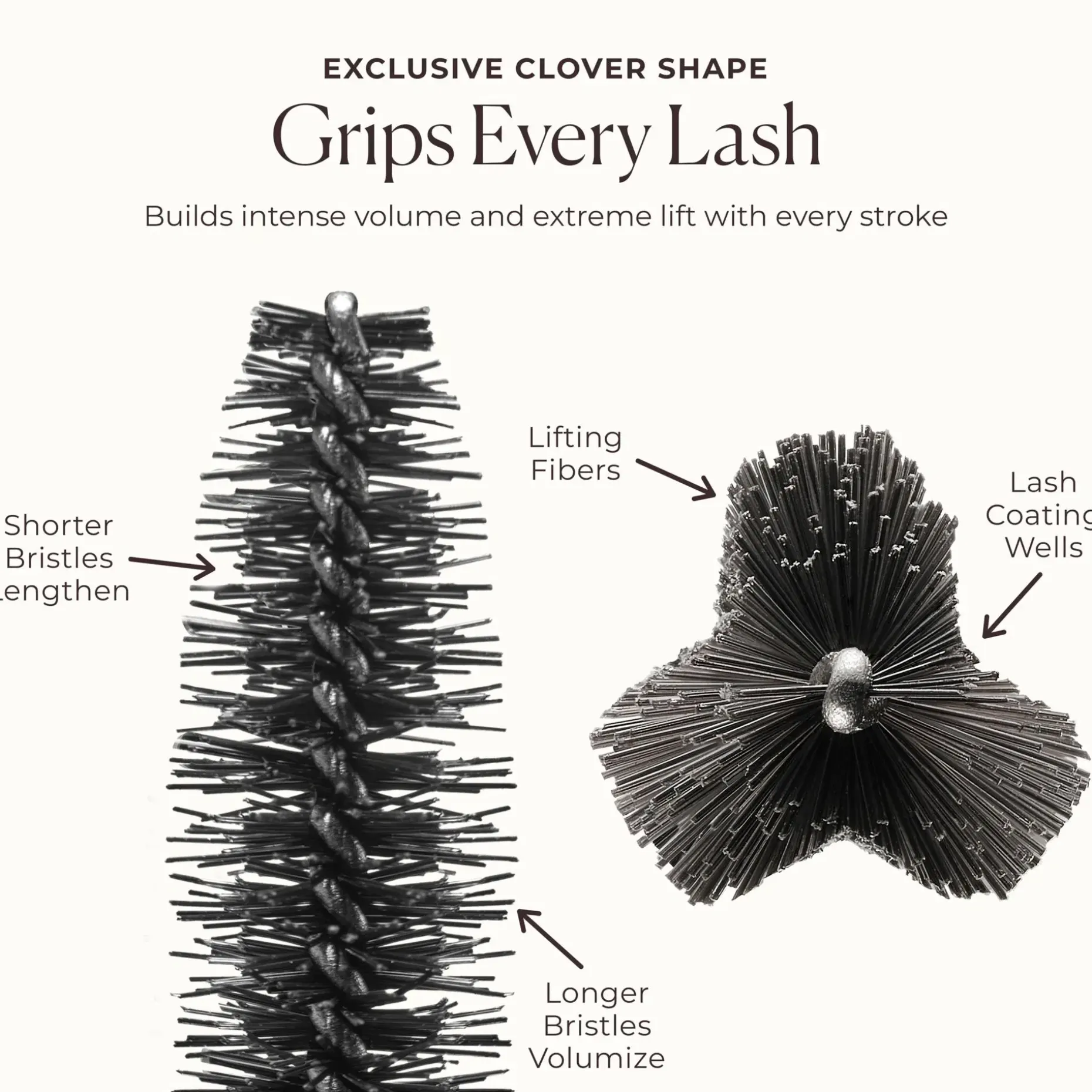 Taiteilijoiden innoittama, ainutlaatuinen apilan muotoinen harja tarttuu ripsiin tyvestä kärkeen erotellen ripset toisistaan mustilla magentanvärisillä pigmenteillä samalla, kun tahraamattoman ja leviämättömän ripsivärin hoitavat ainesosat vahvistavat ripsiä näkyvästi ajan mittaan.