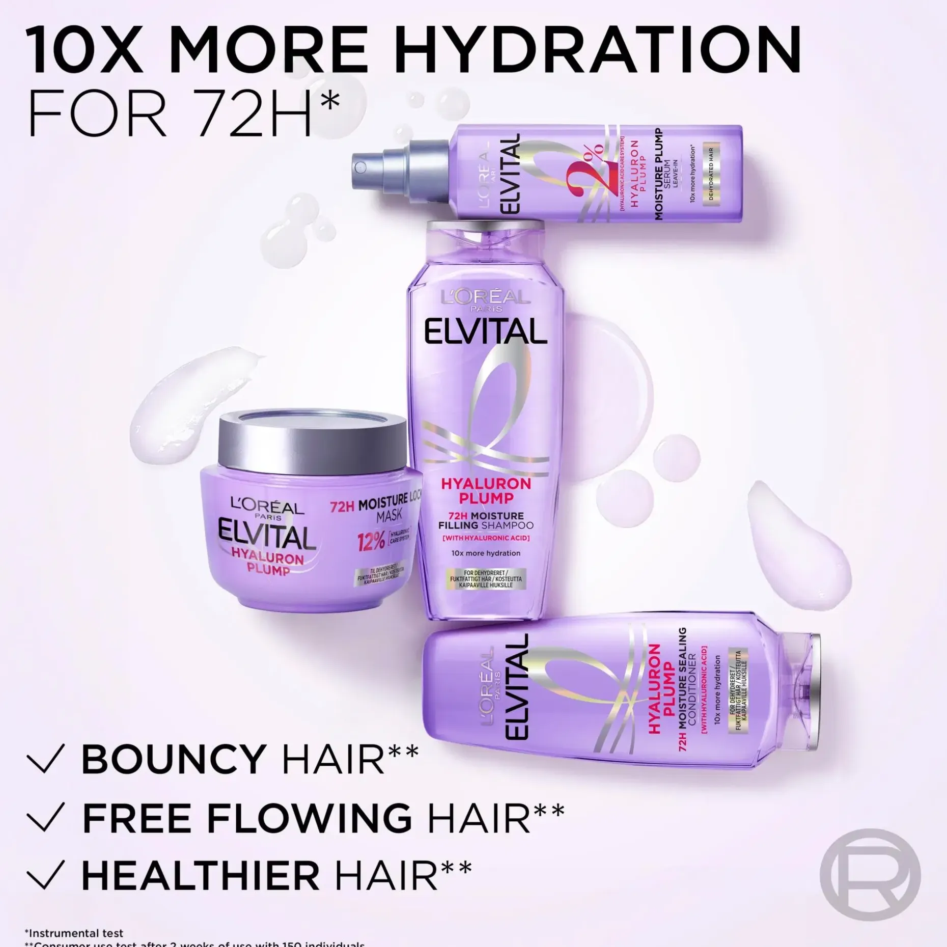 L’Oréal Paris Elvital Hyaluron Plump 72H* kosteuttava hiusnaamio antaa hiuksille intensiivisesti kosteutta ja tekee niistä täyteläisemmät ja 10x kosteutetummat* ilman latistavaa vaikutusta.