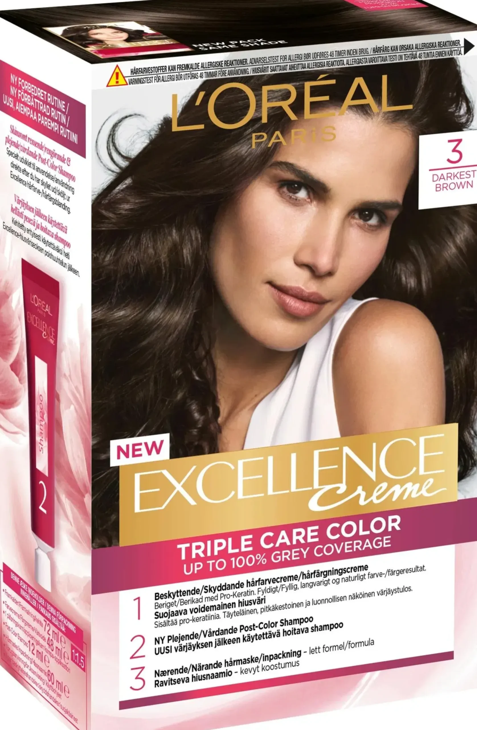 Uusi Triple Care Color peittää harmaat 100%:sti. SUOJAAVA VÄRIVOIDE sisältää pro-keratiinia ja suojaavaa seerumia. Suojaa hiuksia värjäyksen aikana. Täyteläinen, luonnollisen näköinen värjäystulos. UUSI RUTIINI: Värjäyksen jälkeen käytettävä hoitava shampoo puhdistaa hellästi loput tuotteesta hiuspohjasta ja hiuksista. UUSI KOOSTUMUS: Ravitseva hiusnaamio, joka sisältää keramideja. Kevyt koostumus, joka ravitsee hiuksia pitkäkestoisesti niitä latistamatta. Silottaa hiuksia tuoden kiillon esiin. Uusi raikas tuoksu. Noudata pakkauksen käyttöohjeita.