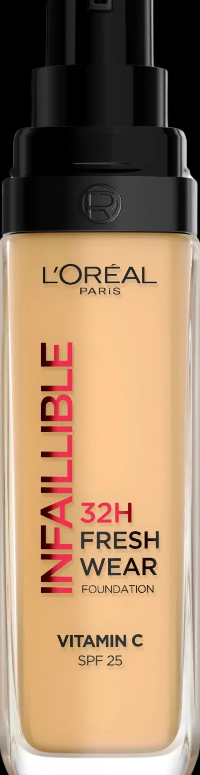 Koe L’Oréal Paris Infaillible 32H* Fresh Wear -meikkivoiteen uusi, entistä parempi koostumus. Nyt koostumuksessa, joka sisältää Cg-vitamiinia ja antaa 32 tuntia kestävän lopputuloksen. Kevyt ja pitkäkestoinen meikkivoide tuntuu keveyeltä iholla ja antaa raikkaan 32 tuntia* kestävän lopputuloksen. Sävy pysyy muuttumattomana koko päivän ajan. Valoa heijastavat mikrohelmet antavat heleän, koko päivän kestävän lopputuloksen ilman, että iho alkaa kiiltää. Cg-vitamiini auttaa lisäämään ihon heleyttä.