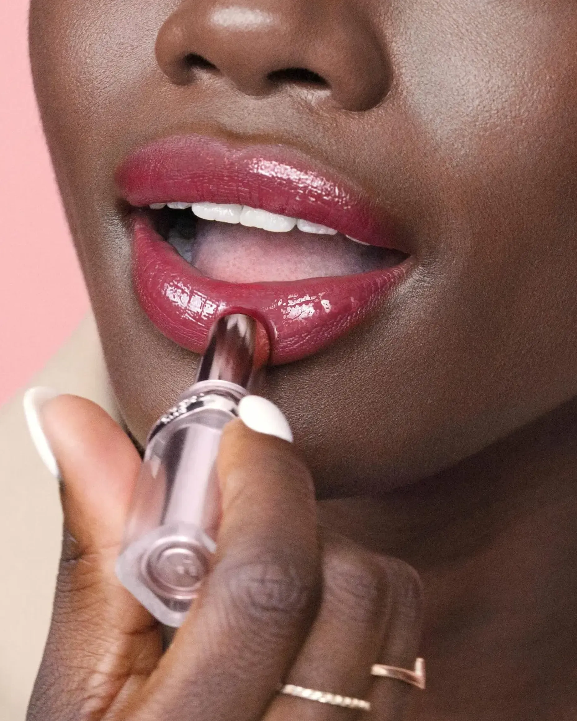 Applicera Glow-Paradise Balm-in-Lipstick från amorbågen och utåt mot mungiporna.