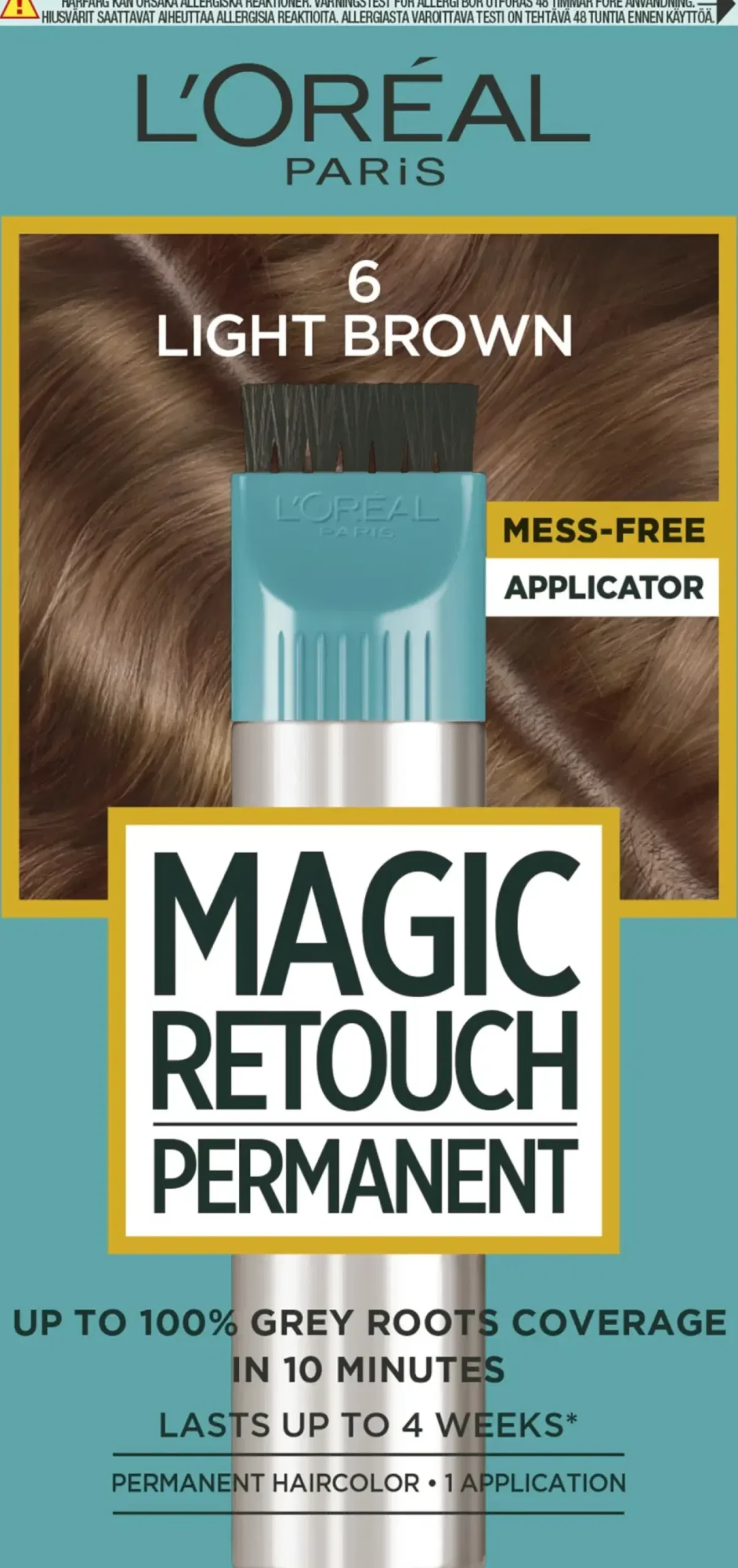 Magic Retouch Permanent -kestoväri tyvikasvun peittämiseen on nopea ratkaisu kampaamokäyntien tai kotivärjäysten välillä. Se sulautuu omaan hiusväriisi ja antaa upean, tasaisen lopputuloksen ja peittää jopa 100 % harmaista hiuksista vain 10 minuutissa. Tarkalla levityskärjellä peität tyvikasvun helposti, nopeasti ja ilman sotkua.