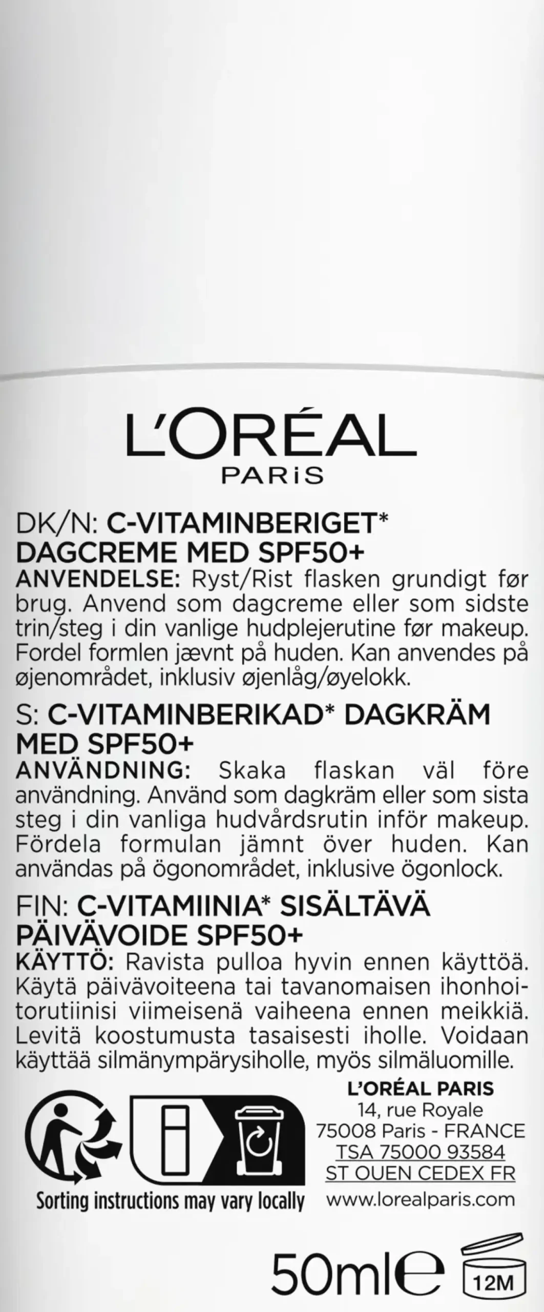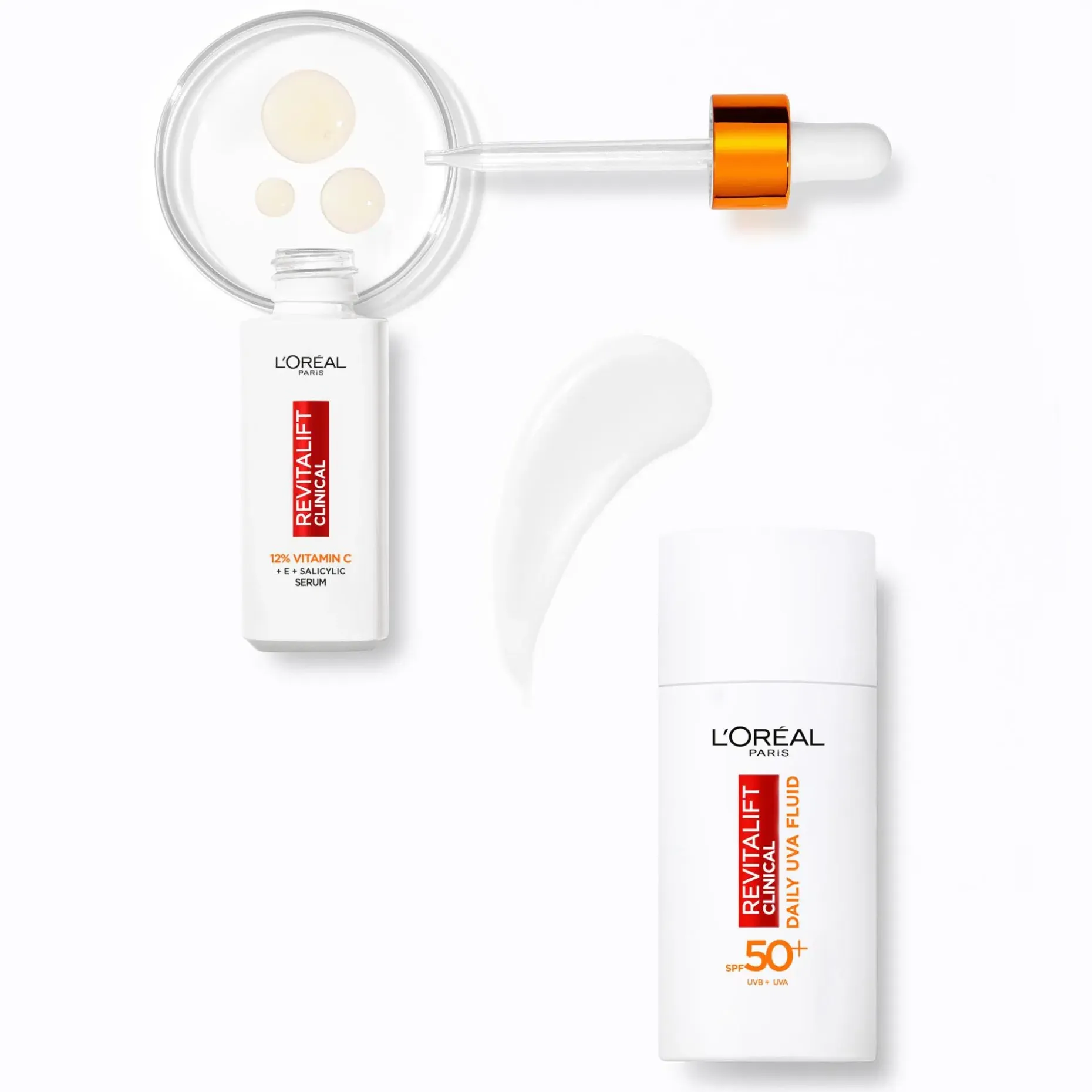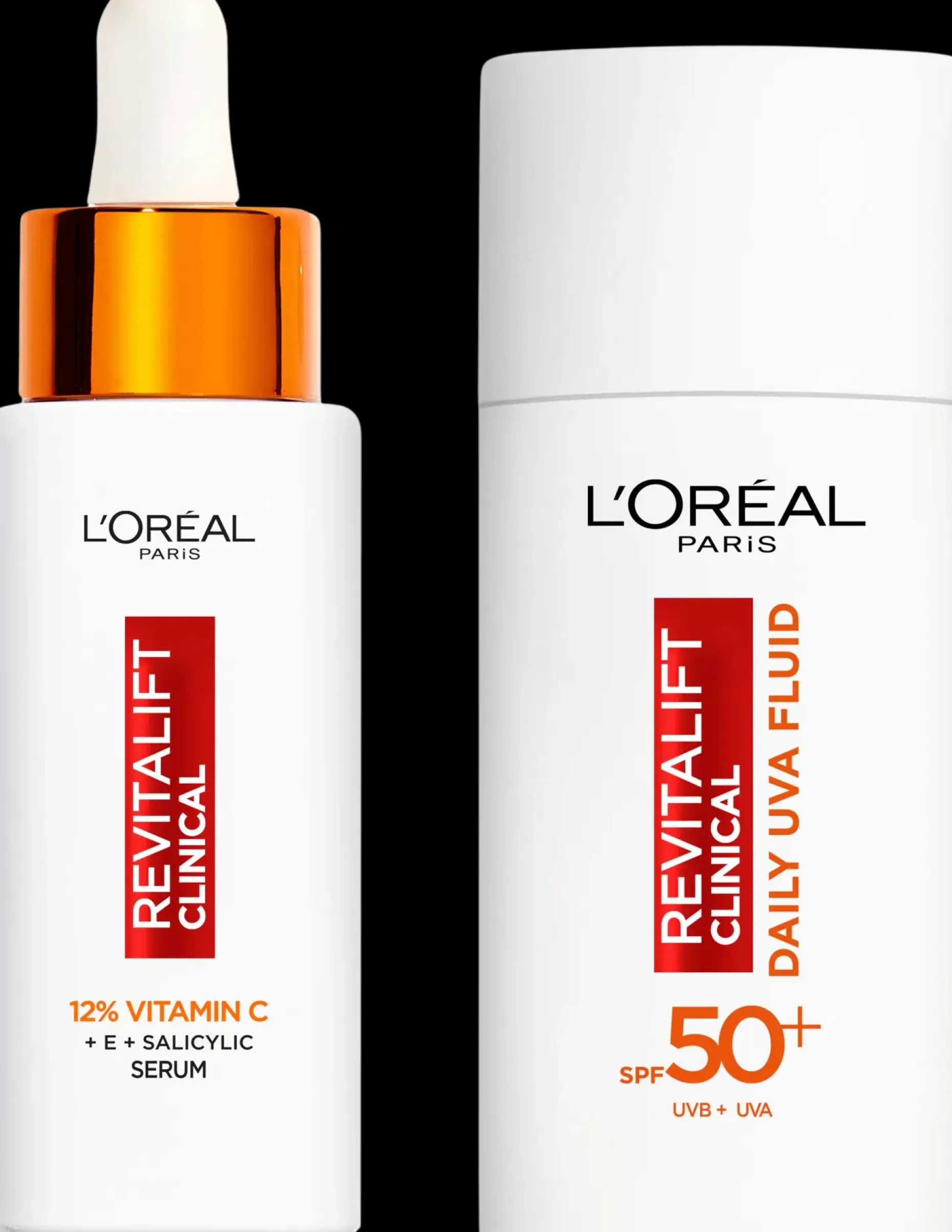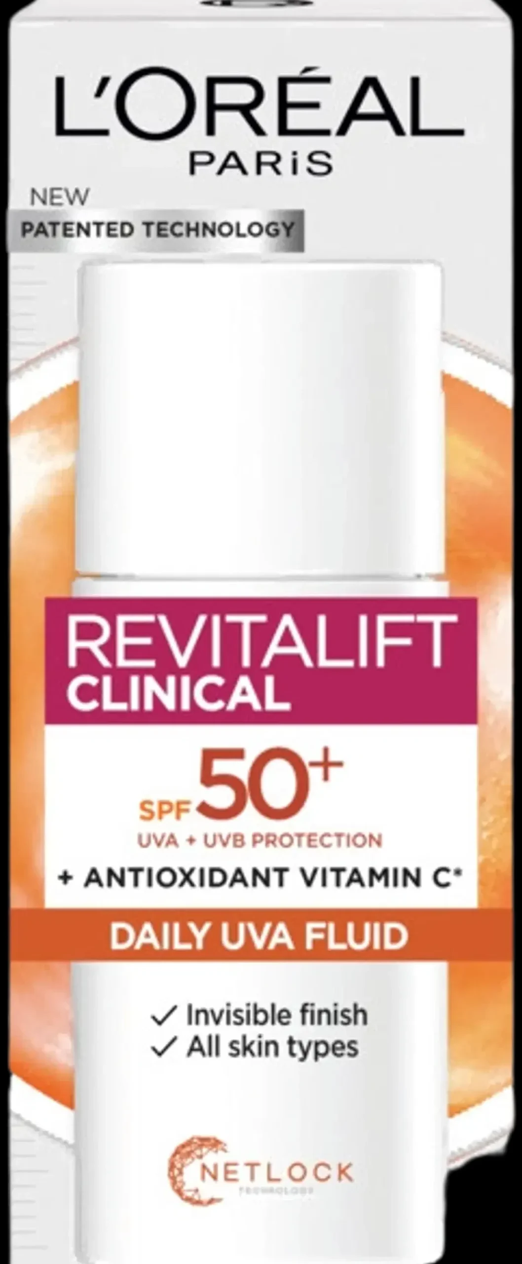 Kokeile L’Oréal Paris Revitalift Clinical Daily UVA Fluid SPF 50 -päivävoidetta. Innovatiivisen kosteuttavan päivävoiteen koostumus sisältää UV-suojan ja antioksidanttista C-vitamiinia*. Kevyt, tahmaamaton koostumus sopii päivittäiseen käyttöön. Tuote sisältää UV-suojan SPF50+, joka suojaa ihoasi pitkiä UVA-säteitä vastaan. Ehkäisee UV-säteilylle altistumisesta johtuvia ikääntymisen merkkejä, kuten tummia pigmenttimuutoksia, ryppyjä ja epätasaista ihon sävyä. Koostumus sisältää C-vitamiinia, joka antaa iholle heleyttä ja tekee ihon laadusta paremman.