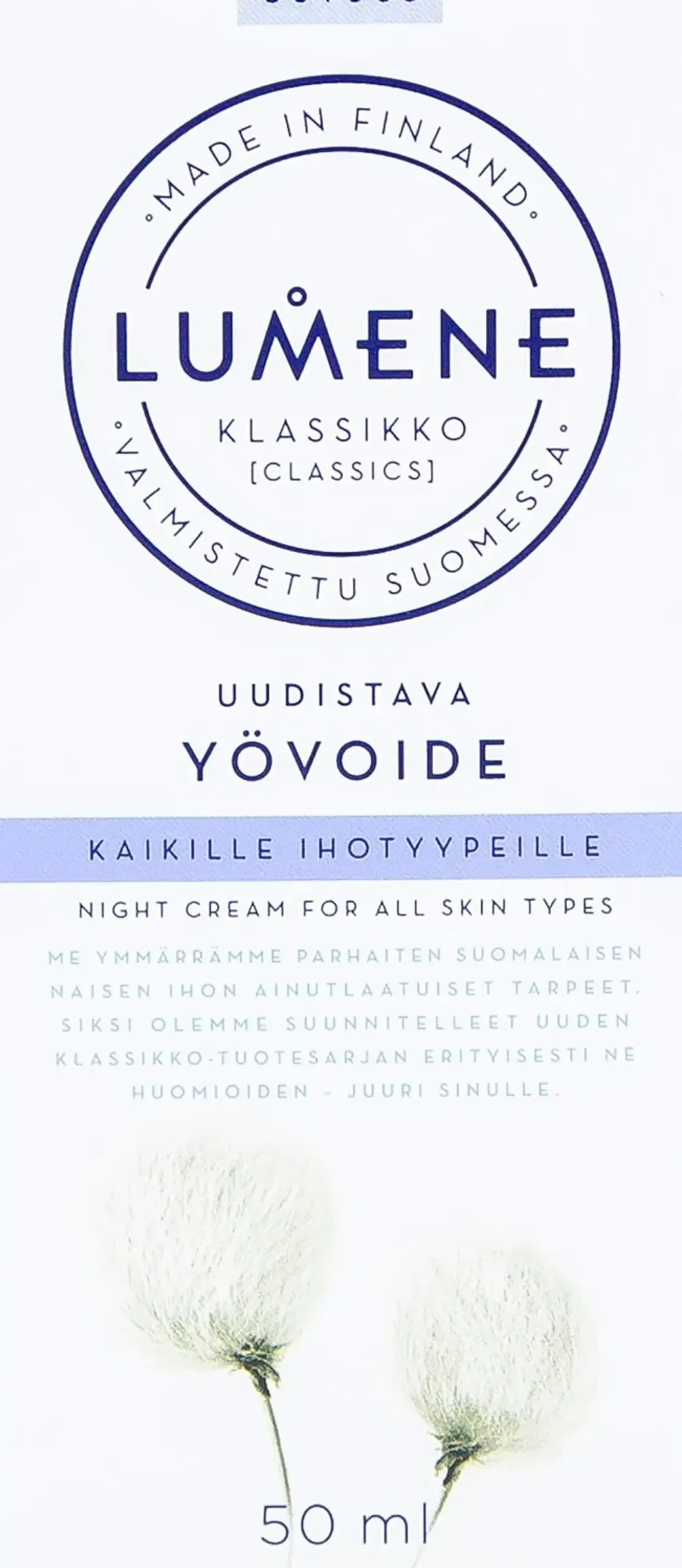 – Kaikille ihotyypeille tarkoitettu Klassikko Uudistava yövoide kosteuttaa ihanteellisesti ja auttaa ihoa palautumaan yön aikana. Ainutlaatuinen yhdistelmä, joka sisältää pohjoista tupasvillaa ja puhdasta pohjoista lähdevettä, kosteuttaa, suojaa ja ravitsee ihoa saaden sen näyttämään kauniilta ja hyvinvoivalta. Formuloitu ilman mineraaliöljyä, parabeeneja ja formaldehydin vapauttajia.