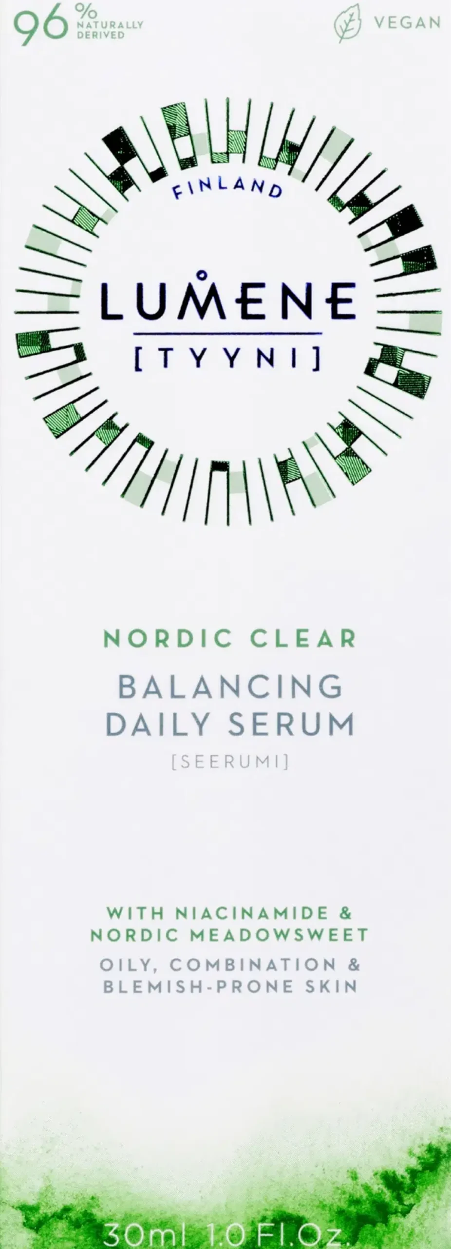 Lumene TYYNI Tasapainottava seerumi rasvoittuvalle, sekaiholle ja epäpuhtauksiin taipuvaiselle iholle sisältää tehokkaan yhdistelmän tasapainottavaa pohjoista mesiangervoa ja rauhoittavaa pohjoista ruusujuurta*. Se vähentää ylimääräistä kiiltoa, auttaa häivyttämään ihohuokosia, epäpuhtauksia ja punaisuutta, sekä kosteuttaa tehokkaasti. Sinkkiglukonaattia ja niasiiniamidia sisältävä kevyt vesipohjainen seerumi tuntuu raikkaalta ja imeytyy nopeasti ilman tahmeaa tunnetta, jättäen ihon luonnollisen mattapintaiseksi sekä tasapainoisen ja hyvinvoivan näköiseksi. Ei-komedogeeninen**.