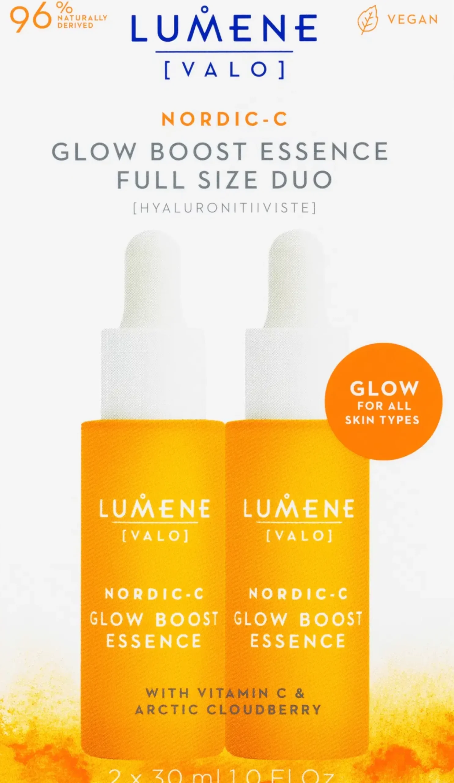 Nordic-C [Valo] tuplapakkaus sisältää 2 täysikokoista 30ml Nordic-C [Valo] Kirkastavaa hyaluronitiivistettä joka heleyttää, kosteuttaa ja virkistää jättäen ihon näkyvästi kirkkaammaksi.
