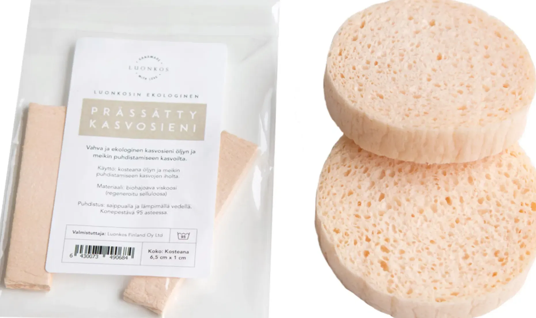 Vahvat ja ekologiset kasvosienet puhdistavat öljyn ja meikin kasvoilta hellävaraisesti. Sienet toimitetaan prässättyinä ja kuivina. Kasvosienet myydään kahden kappaleen muovittomissa pusseissa.