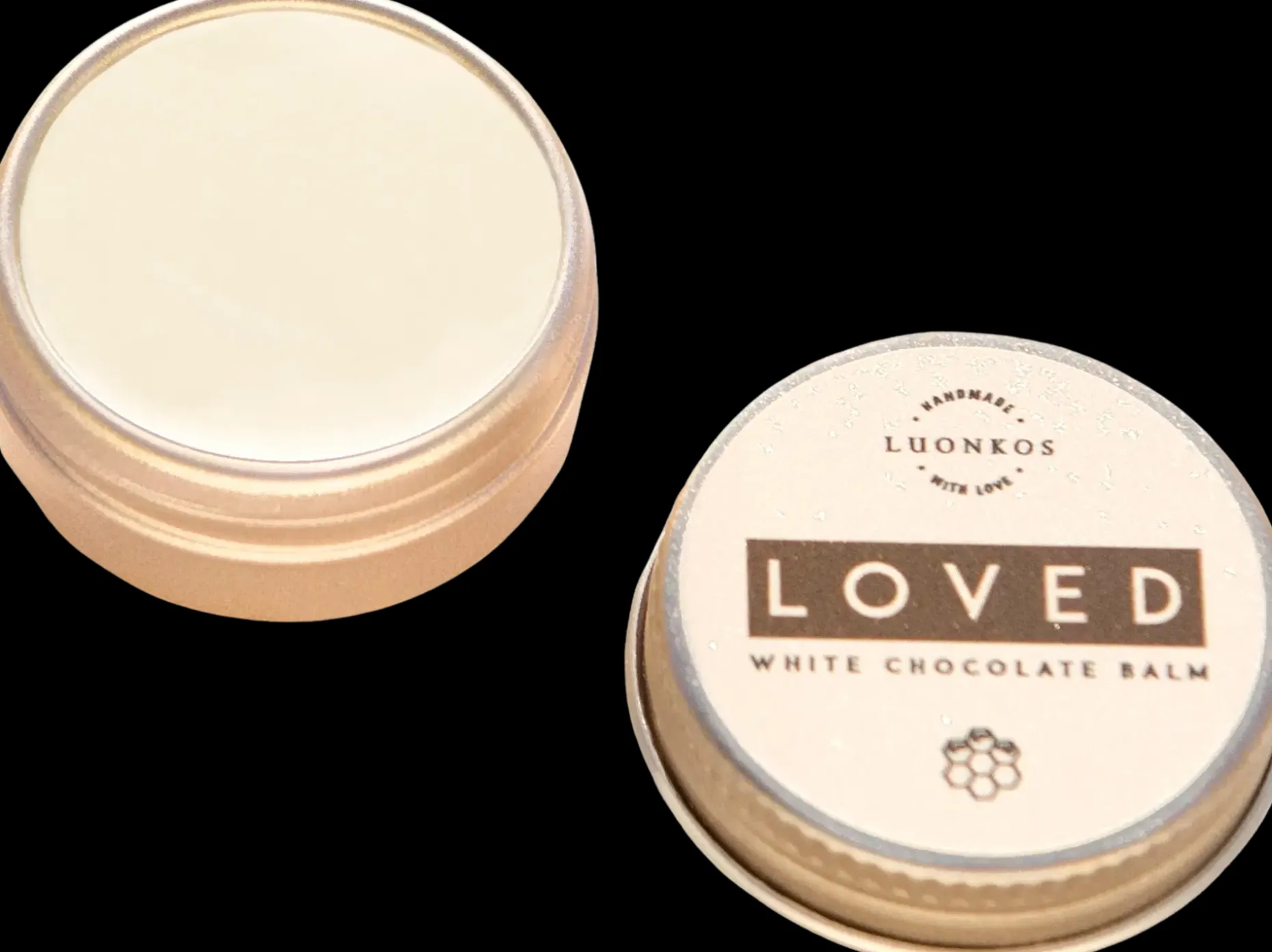 Hoitava Loved-valkosuklaabalsami huulille, rohtumille, pienille naarmuille ja kynsinauhoille. Balsami sisältää mm. mustanmehiläisen vaha, joka suojaa ihoa ulkoisilta rasituksilta. Miedon suklainen ja makean tuoksuinen balsami sopii koko perheelle.