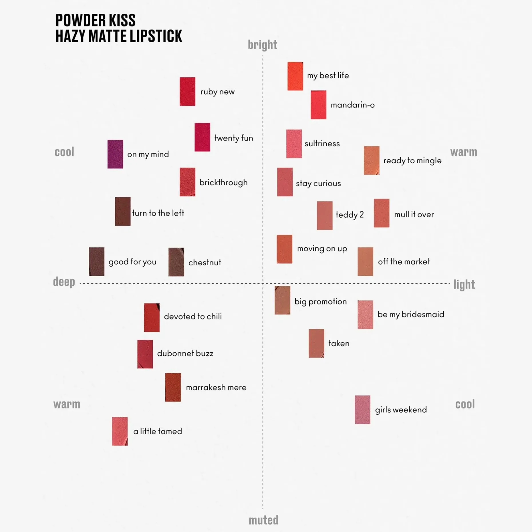 Powder Kiss Hazy Matte Lipstick on nestemäinen mattahuulipuna, joka antaa huulille pehmeän, kevyesti puuterimaisen sävyn. Koostumuksessa käytetyn neljän soft-focus-puuterin ansiosta tämä huulipuna luo täydellisen utuisen efektin ja kerrostettavan peittävyyden läpikuultavasta keskitasoon – sekä pysyy kosteuttavana jopa 10 tunnin ajan.