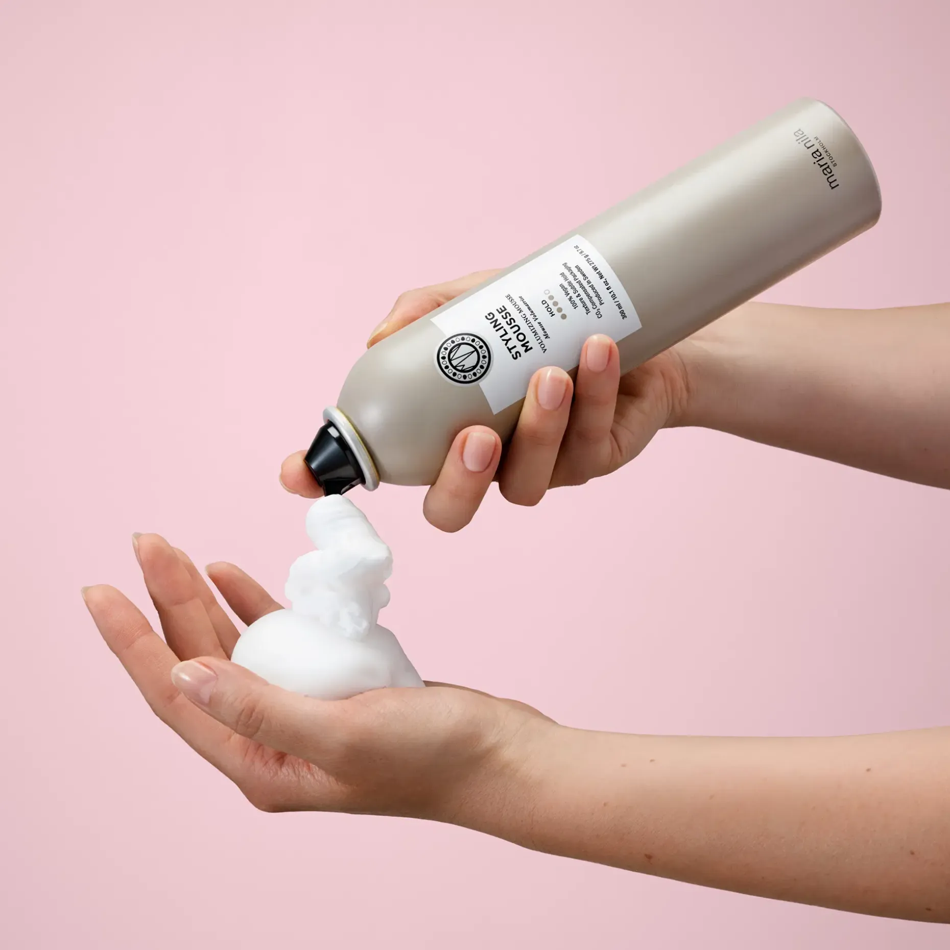 Volyymia, medium pitoa ja kiiltoa antava vaahto. Ei tartu, ja on helppo harjata pois hiuksista. Ravista pulloa kunnolla. Käännä pullo pystysuoraan ja käytä sitä kosteisiin hiuksiin ennen föönausta tai anna kuivua itsestään. Colour Guard Complex suojaa hiuksia. Sulfaatiton ja parabeeniton, 100 % vegaaniset aineosat. Pakkaukset ovat lisäksi ilmastokompensoitu.