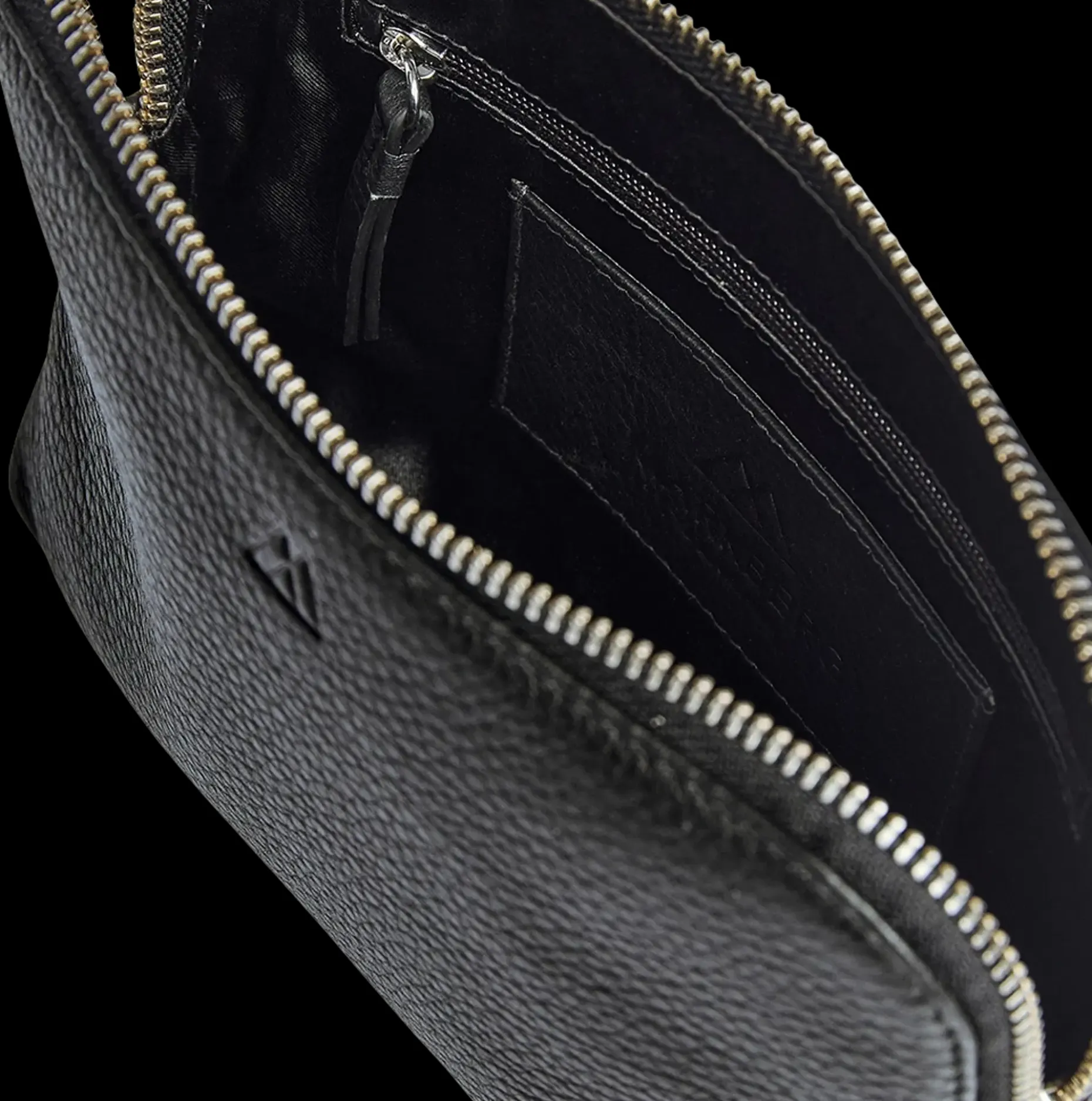 Sisällä vetoketjutasku ja korttitasku. Voi käyttää clutchina tai pussukkana meikeille/pikkutavaroille isomman laukun sisällä.