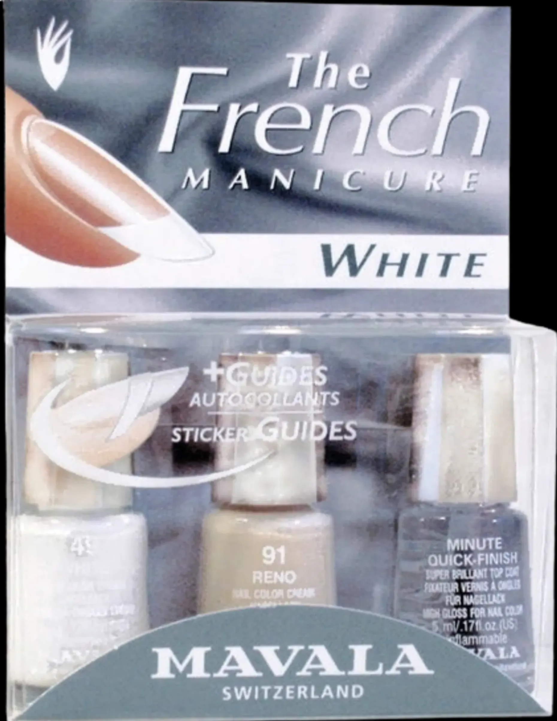 Ranskalainen manikyyripakkaus sisältää ohjeet ranskalaisen manikyyrin tekoon, tarrat sekä kolme 5 ml:n lakkapulloa: valkosävyinen lakka kynnen kärkeen, värilakka ja Minute-Quick-Finish -nopeasti kuivuva päällyslakka.