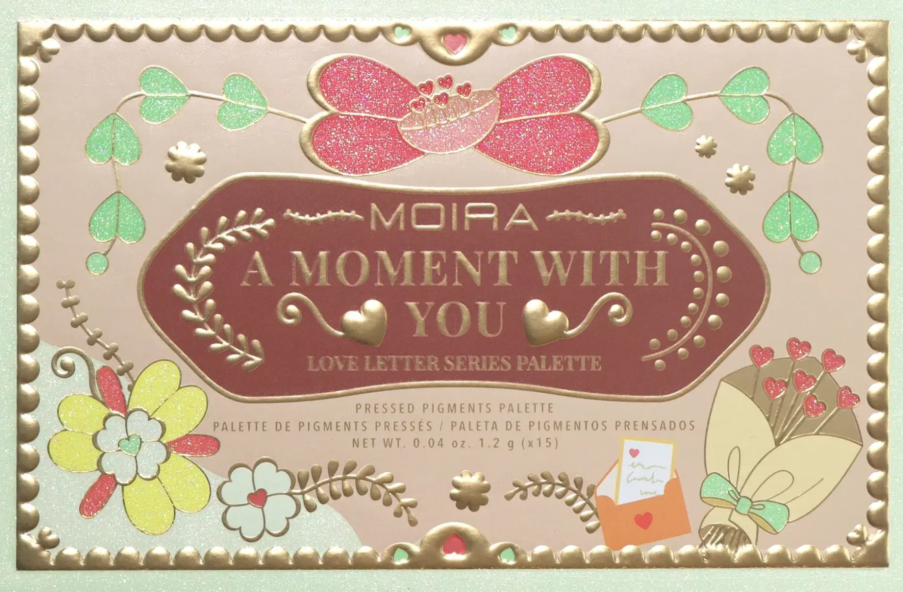 MOIRA Love Letter -sarja on saanut inspiraationsa menneistä ja nykyisistä rakkauden hetkistä. Jokainen paletti sisältää yhteensä 15 sävyä, joiden joukossa on upeita helmiäis-, dual chrome- ja mattasävyjä – täydellisiä luovien silmämeikkien aikaansaamiseen. Paletin avulla voit luoda monipuolisesti erilaisia meikkilookkeja. A Moment With You on kaikki mitä tarvitset!