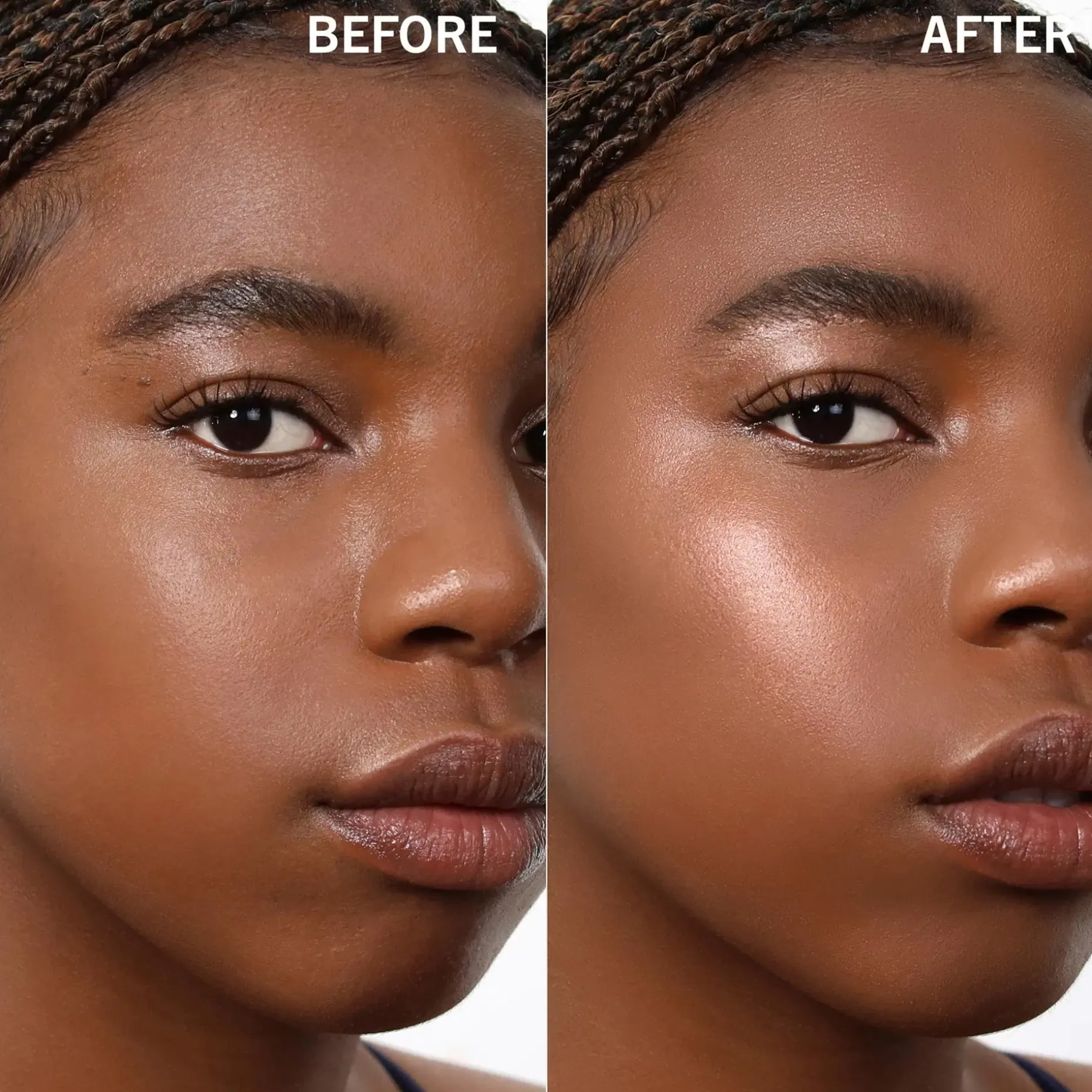 Korostustuotteena: Meikkaa tavalliseen tapaan. Lisää pieni määrä Glow Show Liquid Highlighteria halutuille alueille; tyypillisesti poskipäille, nenän varteen ja päähän, silmien sisänurkkiin ja amorin kaarelle. Häivyttele sormella.