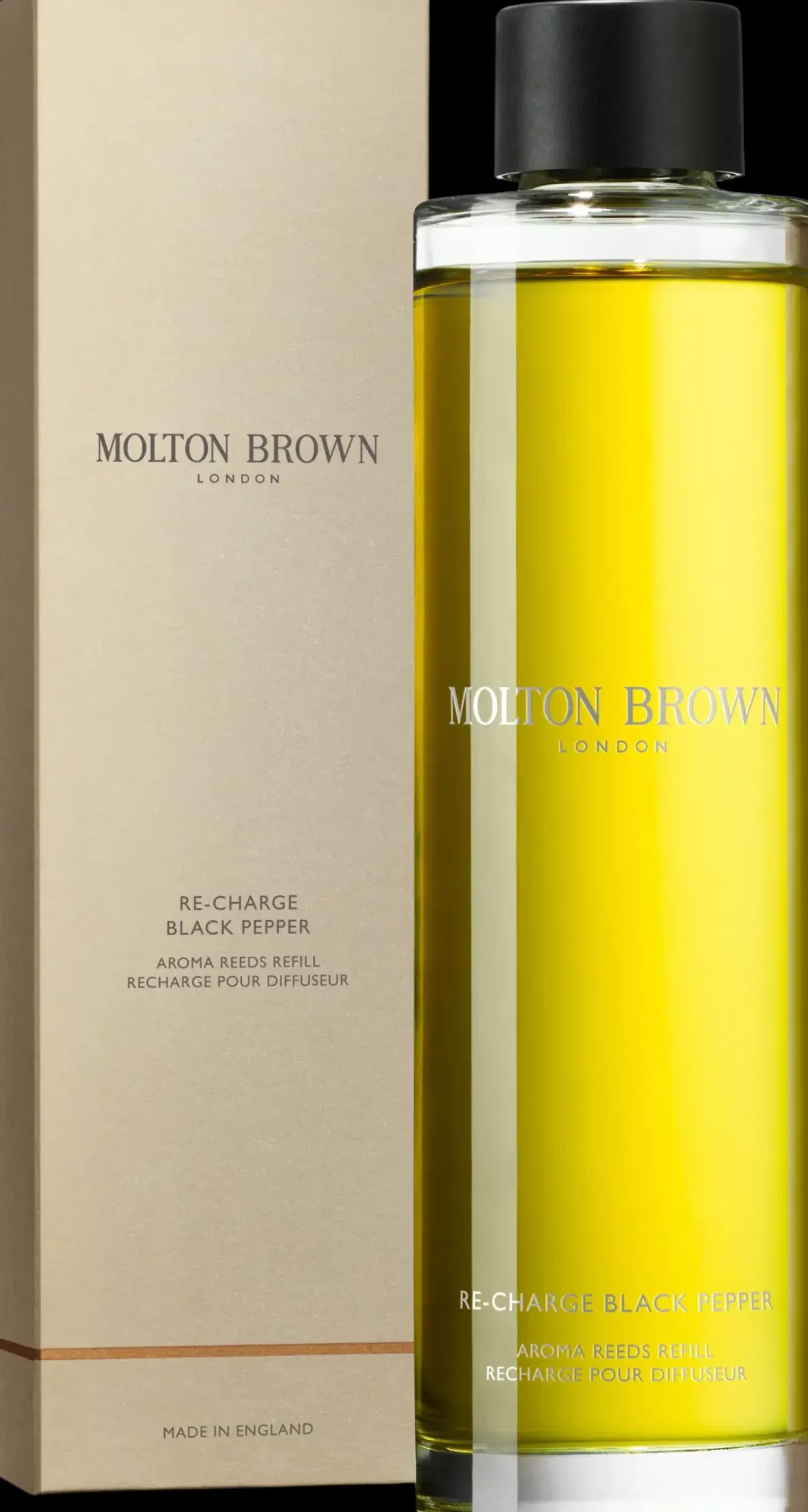 Molton Brown Re-Charge Black Pepper -tuoksutikkujen uudelleentäyttöpakkauksella voit täyttää tuoksutikkujen öljyn ja nauttia edelleen