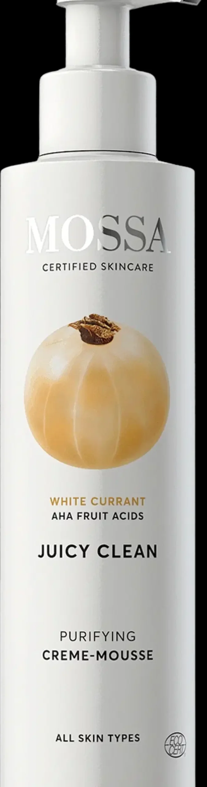 Mossan puhdistusemulsio muuttuu iholla veden kosketuksesta vaahdoksi. Se sisältää valkoherukan AHA-hedelmähappoja. Ne tekevät kasvojen ihosta puhtaan, raikkaan ja hehkuvan.