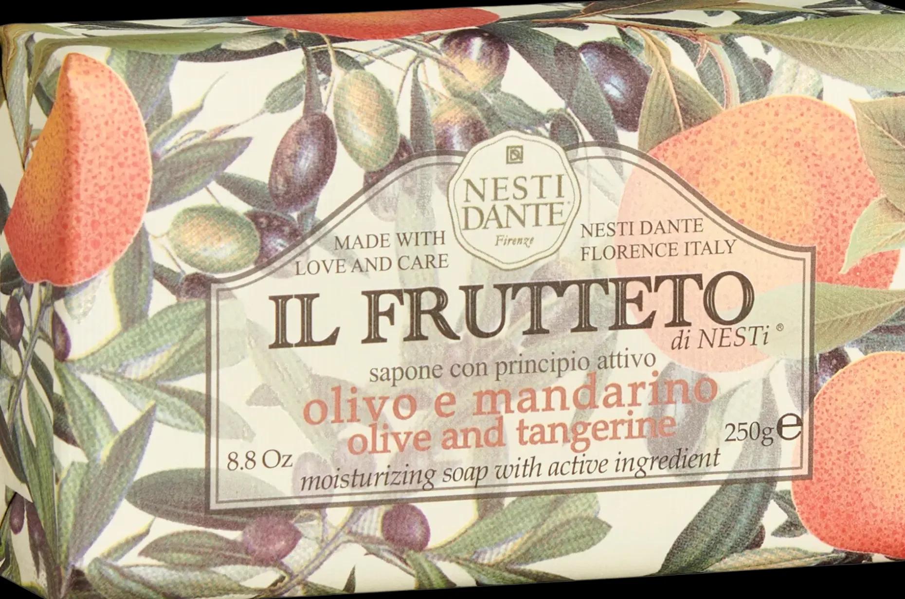 Mandariinin tuoksuinen ja oliiviöljypohjainen vegaaninen palasaippua, pehmeästi vaahtoava.