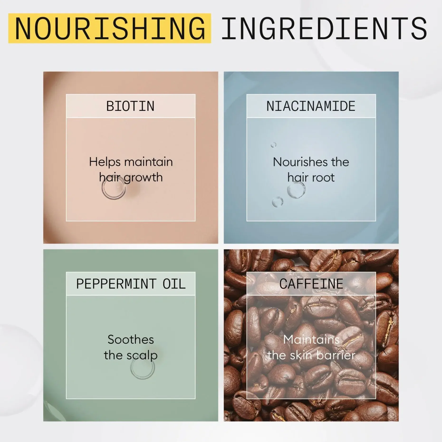 Treatment: Aqua/Water/Eau, Niacinamide, Caffeine, Phenoxyethanol, Sodium Benzoate, Benzyl Alcohol, Acrylates/C10-30 Alkyl Acrylate Crosspolymer, Polysorbate 80, Polysorbate 60, Acetamide MEA, Triethanolamine, PEG-23M, Propylene Glycol, Tetrasodium EDTA, Methyl Nicotinate, Parfum/Fragrance, Mentha Arvensis Leaf Oil, Mentha Piperita (Peppermint) Oil, PEG-30 Dipolyhydroxystearate, Trideceth-6, Limonene, Camellia Sinensis Leaf Extract, Silica, Cystine Bis-PG-Propyl Silanetriol, Biotin, Lecithin, Tocopheryl Acetate, Humulus Lupulus (Hops) Flower Extract, Citrus Paradisi (Grapefruit) Peel Extract, Urtica Dioica (Nettle) Leaf Extract, Acer Saccharum (Sugar Maple) Extract, Citrus Limon (Lemon) Peel Extract, Saccharum Officinarum/Sugar Cane Extract/Extrait de canne a sucre, Vaccinium Myrtillus Leaf Extract, Faex Extract/Yeast Extract/Extrait de levure, Propylparaben, Citrus Aurantium Dulcis (Orange) Fruit Extract, BHT, Potassium Sorbate, Maltodextrin, Methylparaben, Ethylparaben, Butylparaben.