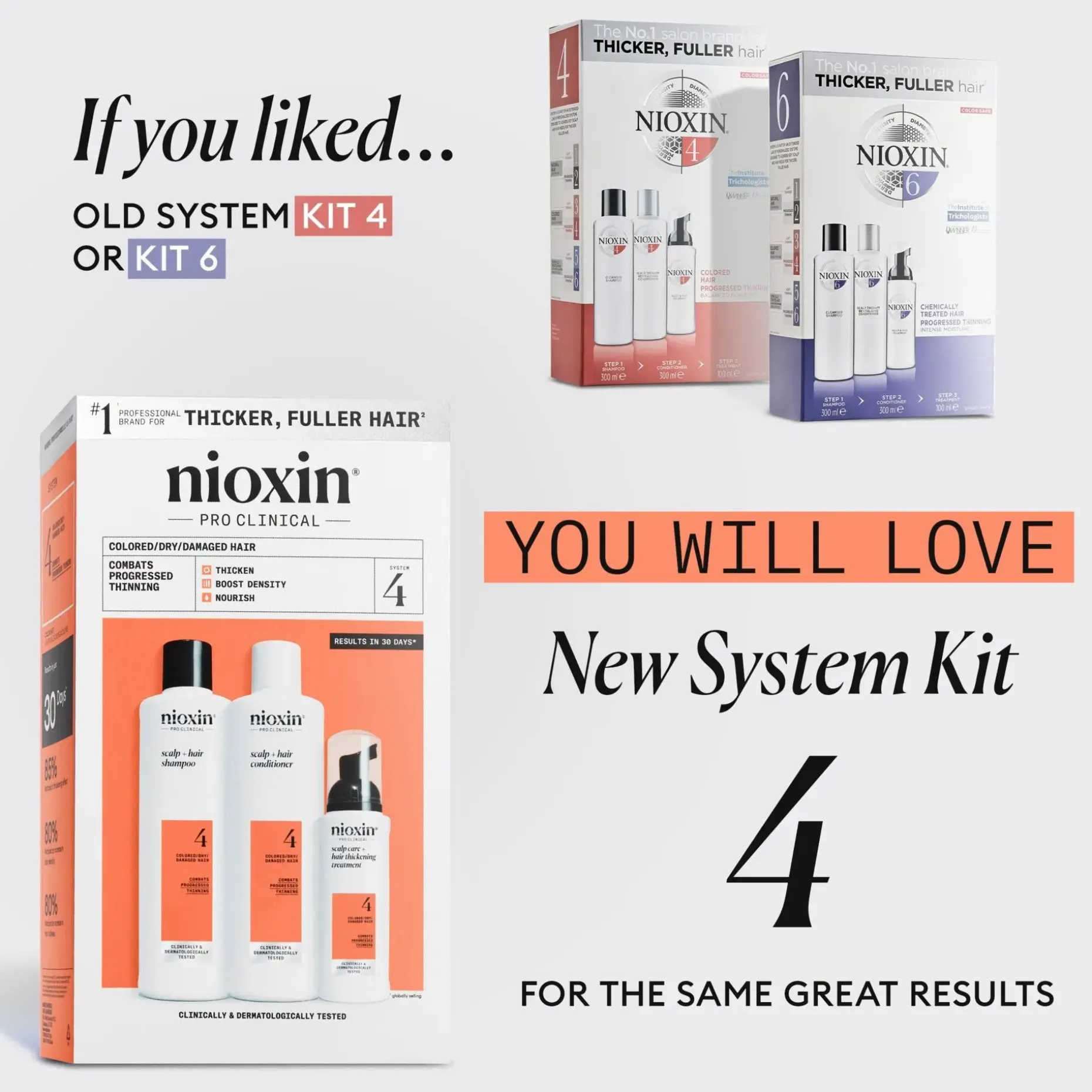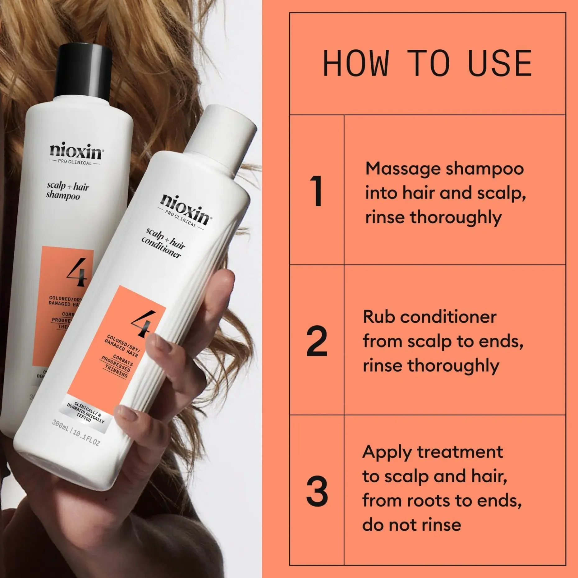 Nioxin System 4 Loyalty Kit -hiustenhoitojärjestelmä värjätyille, selvästi ohentuneille hiuksille. Ainutlaatuinen kolmen hiustenhoitotuotteen setti on kehitetty erityisesti tuuhentamaan hiuksia. Suojaa väriä ja tekee hiuksista täyteläisemmät. Nioxin System 4 raikastaa hiuspohjaa, vähentää katkeilun aiheuttamaa hiustenlähtöä, vahvistaa ja antaa värjätyille hiuksille tervettä kiiltoa. Nioxin Cleanser -shampoo poistaa lian, ylimääräisen talin ja muut ympäristöjäämät hiuspohjasta ja hiuksista. Nioxin Scalp Therapy -hoitoaine on kevyt hoitoaine, joka auttaa vahvistamaan hiuksia ja kosteuttaa hiuspohjaa ja hiuksia tyvestä latvaan. Nioxin Scalp & Hair Treatment raikastaa hiuspohjaa ja auttaa tekemään hiuksista tuuheammat lisäämällä jokaisen hiuksen paksuutta. Pakkauksen on kliinisesti osoitettu vähentävän katkeilun aiheuttamaa hiustenlähtöä jopa 91 %**.