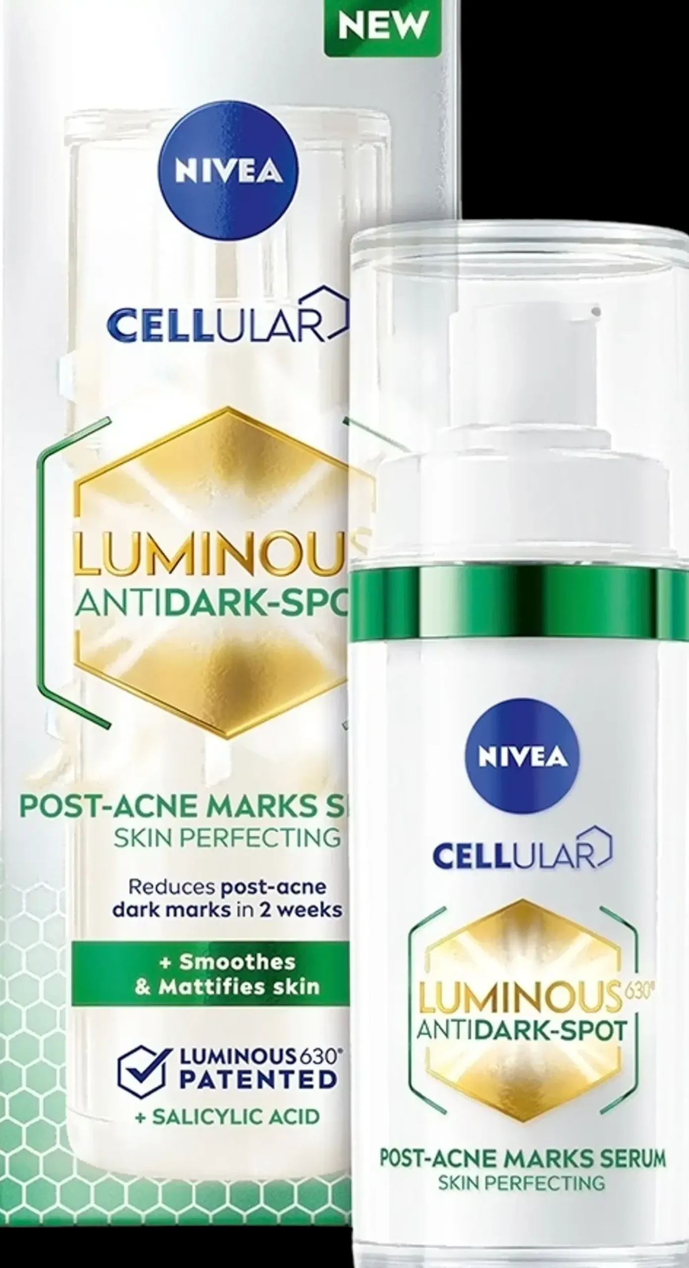 NIVEA Cellular Luminous630 Post-Acne Marks Serum -kasvoseerumi tasapainottaa pigmentaatiota solutasolla vähentääkseen pigmenttiläiskiä ja ehkäistäkseen niiden