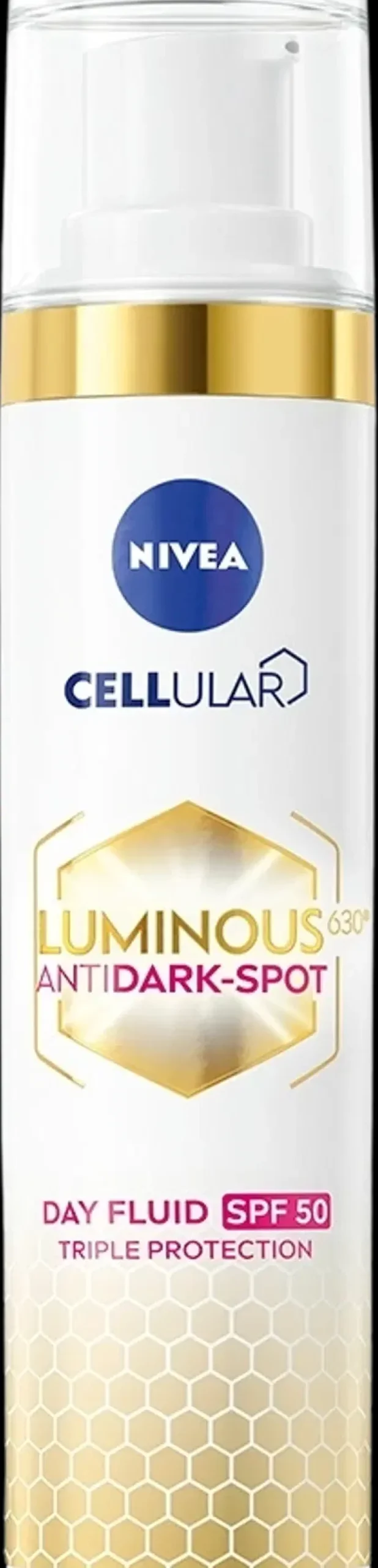 NIVEA Cellular Luminous630 Anti Dark-Spot Day Fluid SK0 -päivävoide suojaa jo olemassa olevia pigmenttiläiskiä tummenemiselta ja ehkäisee niiden uudelleensyntymistä. Se ehkäisee myös ihon valovanhenemista samalla kun se kosteuttaa ihoa. Kasvovoide yhdistää innovatiivisen LUMINOUS630:n, suojakertoimen SPF50, soluja aktivoivan hyaluronihapon* ja E-vitamiinin. Uudistettu koostumus sisältää nyt tuplasti E-vitamiinia edelliseen koostumukseen verrattuna. Voide tekee ihosta sileän, kauniin säteilevän ja mattapintaisen. Sopii hyvin meikin alle. Hellävarainen iholle, sopii kaikille ihotyypeille, myös herkälle iholle.