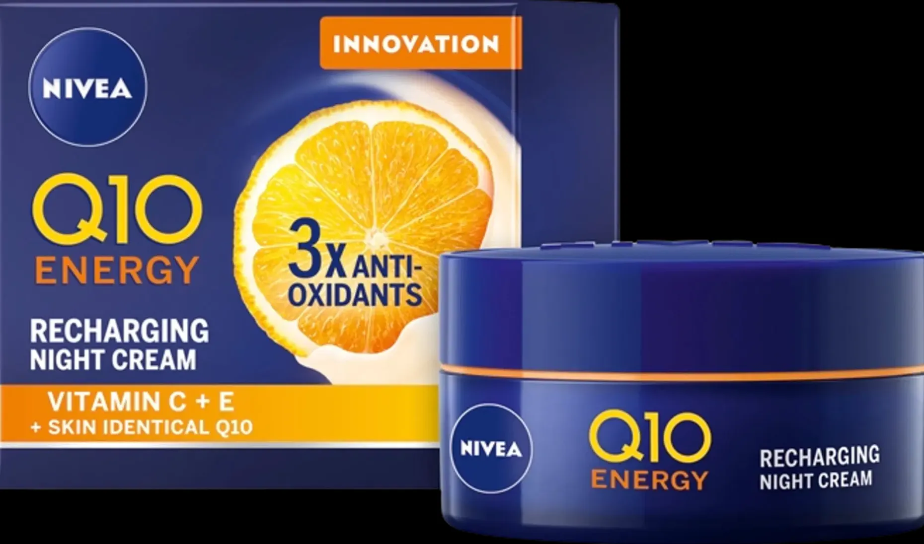 NIVEA Q10 Energy Recharging Night Cream -yövoide antaa samealle, väsyneelle iholle luonnollisen energiaboostin! Vähentää väsymyksen merkkejä ja tasoittaa näkyvästi pieniä juonteita! Syväkosteuttava kosteusvoide tukee ihon kykyä parantaa omaa energia-aineenvaihduntaansa* suojaamalla sitä vapailta radikaaleilta. Koostumuksessa on 3 antioksidanttia: Q10, joka on 100% identtinen ihon oman Q10:n kanssa, C-vitamiini ja E-vitamiini. Jo 2 viikossa ihoa virkistävä ja Q10 -koentsyymin vaikutuksia voimistava C-vitamiini tekee ihosta kimmoisan ja kiinteämmän!* E-vitamiini vahvistaa ihoa ja neutraloi vapaita radikaaleja, jotka nopea auttavat ihon ikääntymistä. Pirteän raikas hedelmäinen tuoksu, jossa on luonnollista appelsiiniuutetta. Levitä iltaisin puhdistetuille kasvoille, kaulalle, decoltee-aluetta unohtamatta. Vältä silmänympärysaluetta. Dermatologisesti testattu. *in vitro.