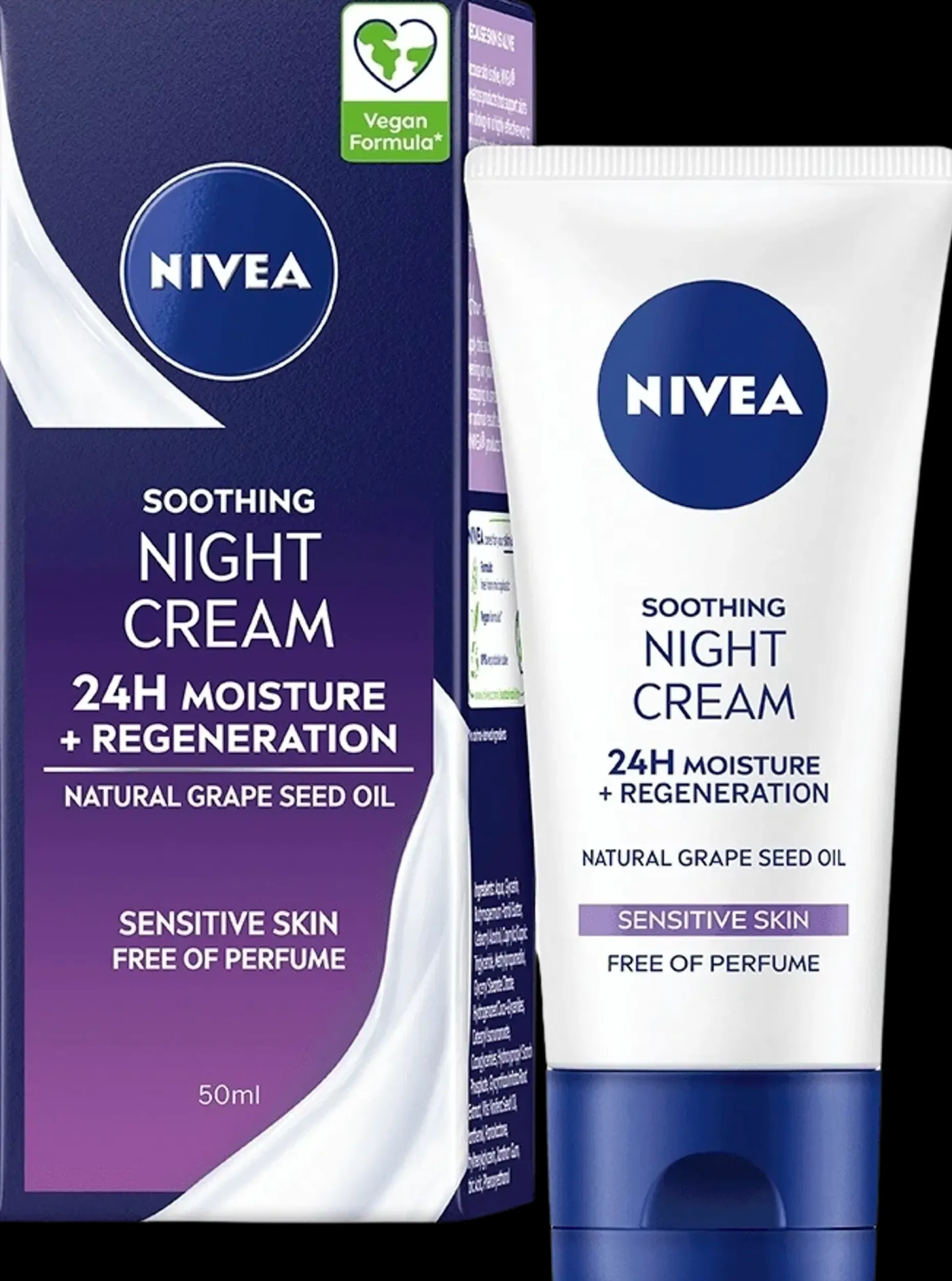 NIVEA Soothing Sensitive Night Cream -yövoiteen erittäin hellävarainen koostumus antaa iholle rauhoittavaa kosteutusta 24 tunnin ajan & uudistaa ihoa. Sisältää: