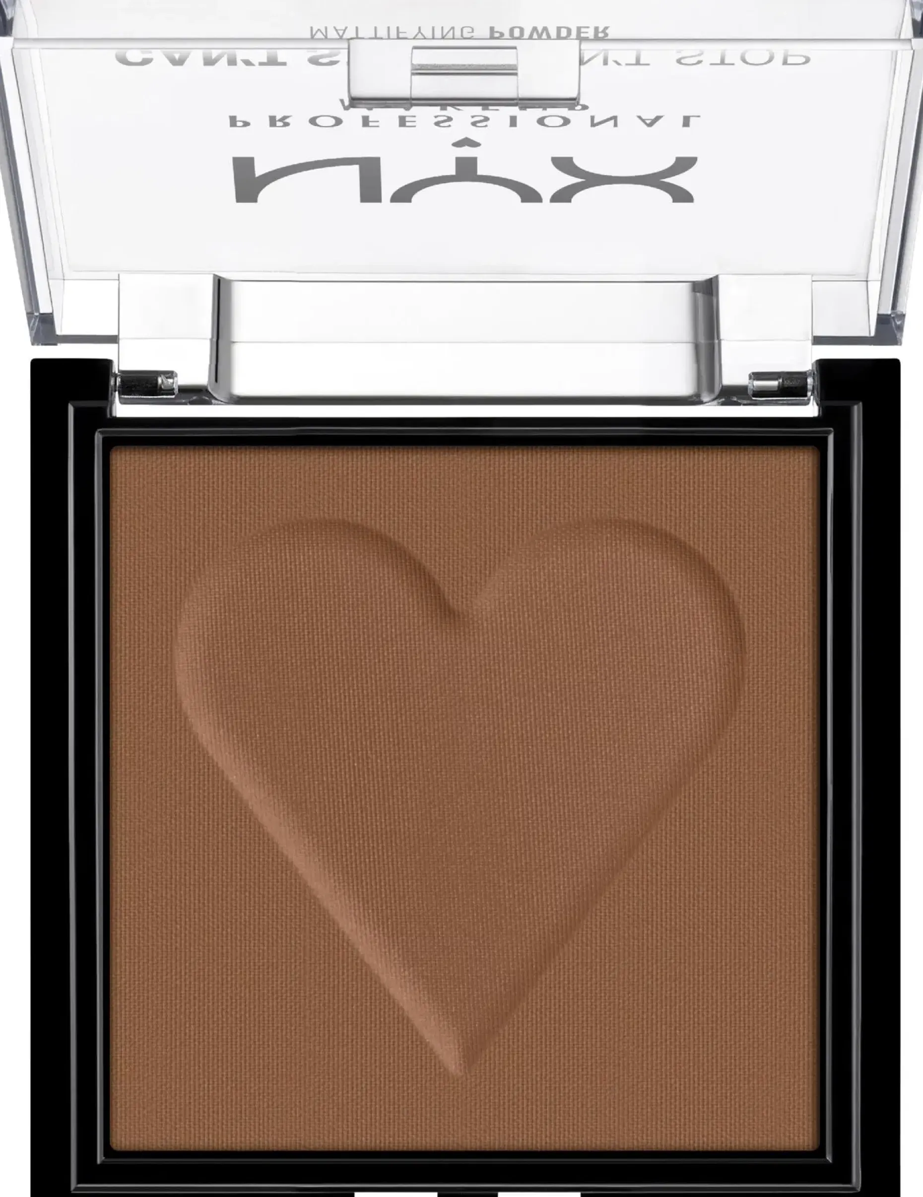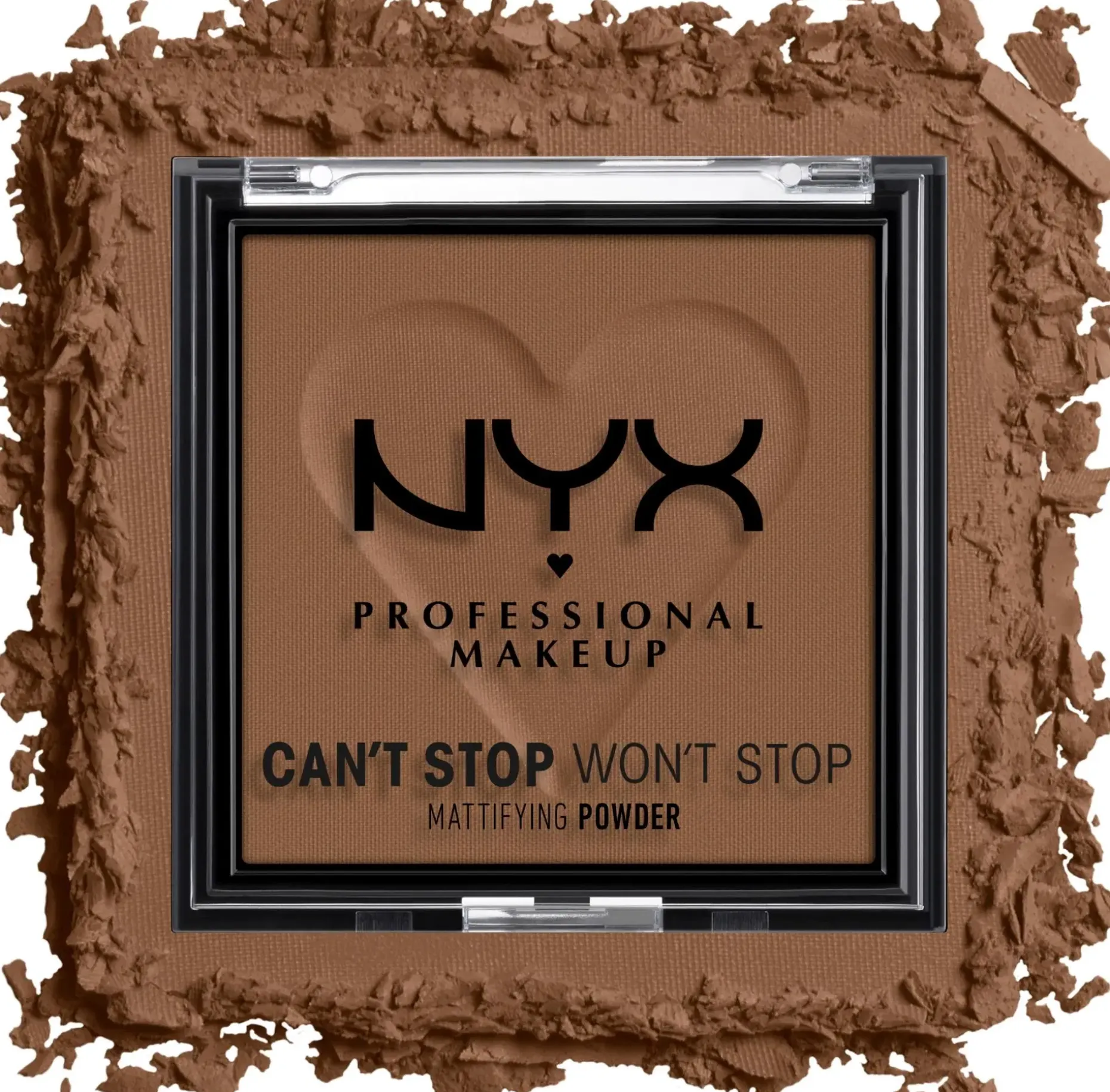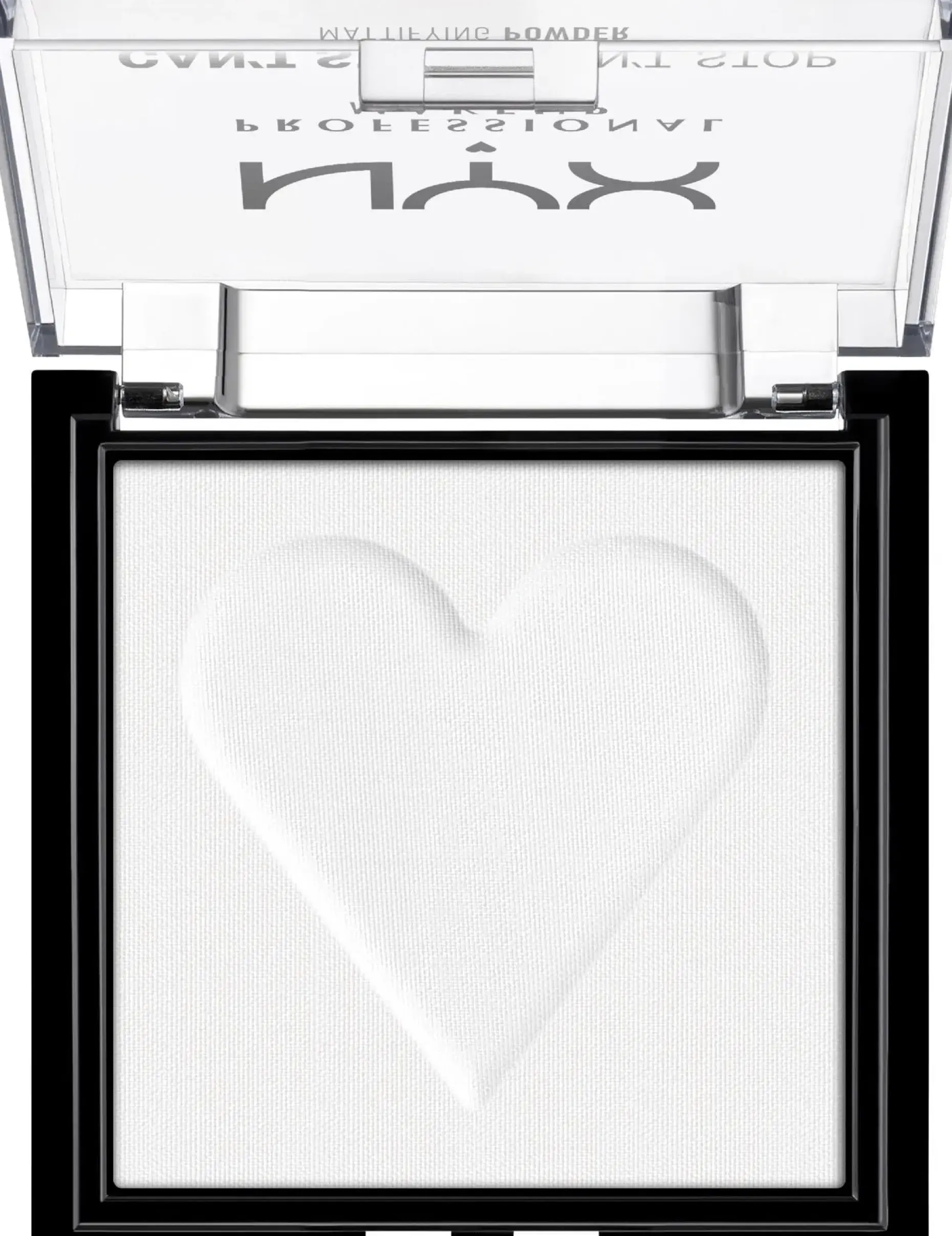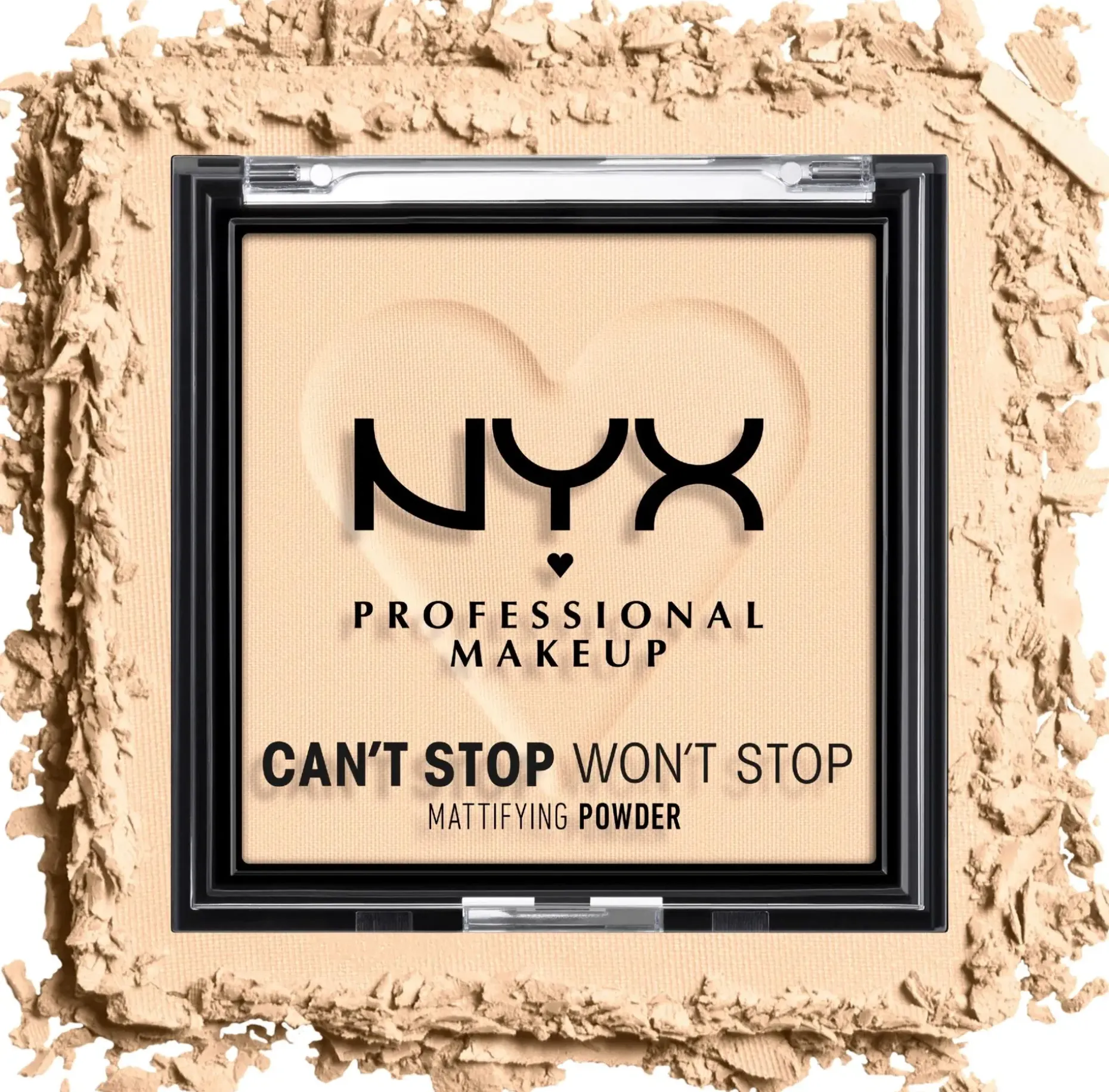 NYX Professional Makeup Can’t Stop Won’t Stop Mattifying Powder -puuteri antaa iholle välittömästi mattapintaisen lopputuloksen ja hillitsee ihon kiiltoa ja rasvaisuutta. ”Kevyt, vegaaninen koostumus* antaa iholle tasaisen, matan lopputuloksen näyttämättä kuivalta, kakkumaiselta tai tunkkaiselta. *Ei sisällä eläinperäisiä ainesosia tai sivutuotteita.