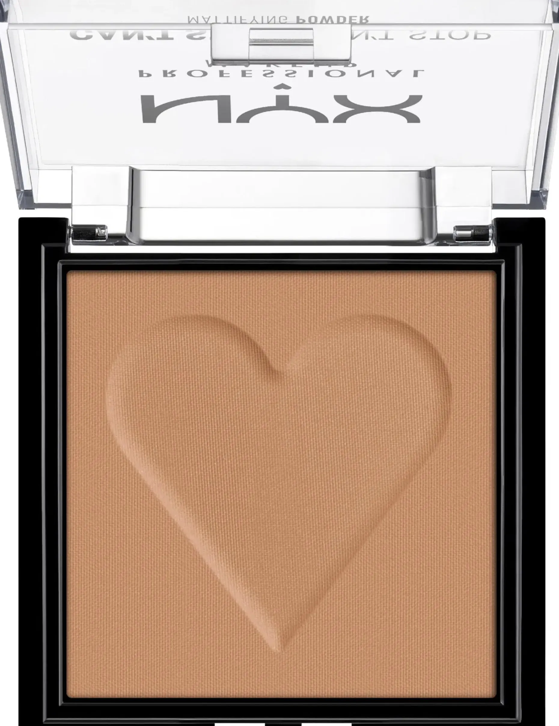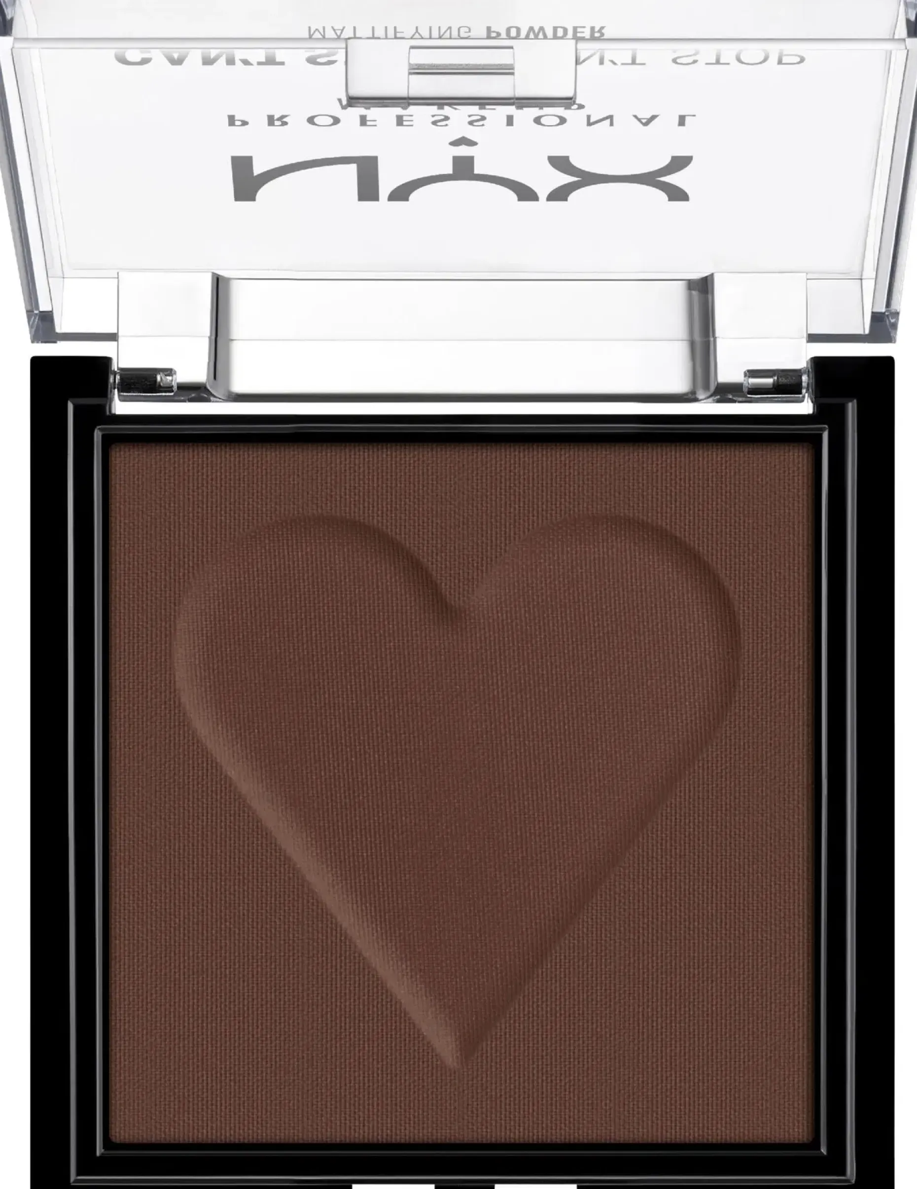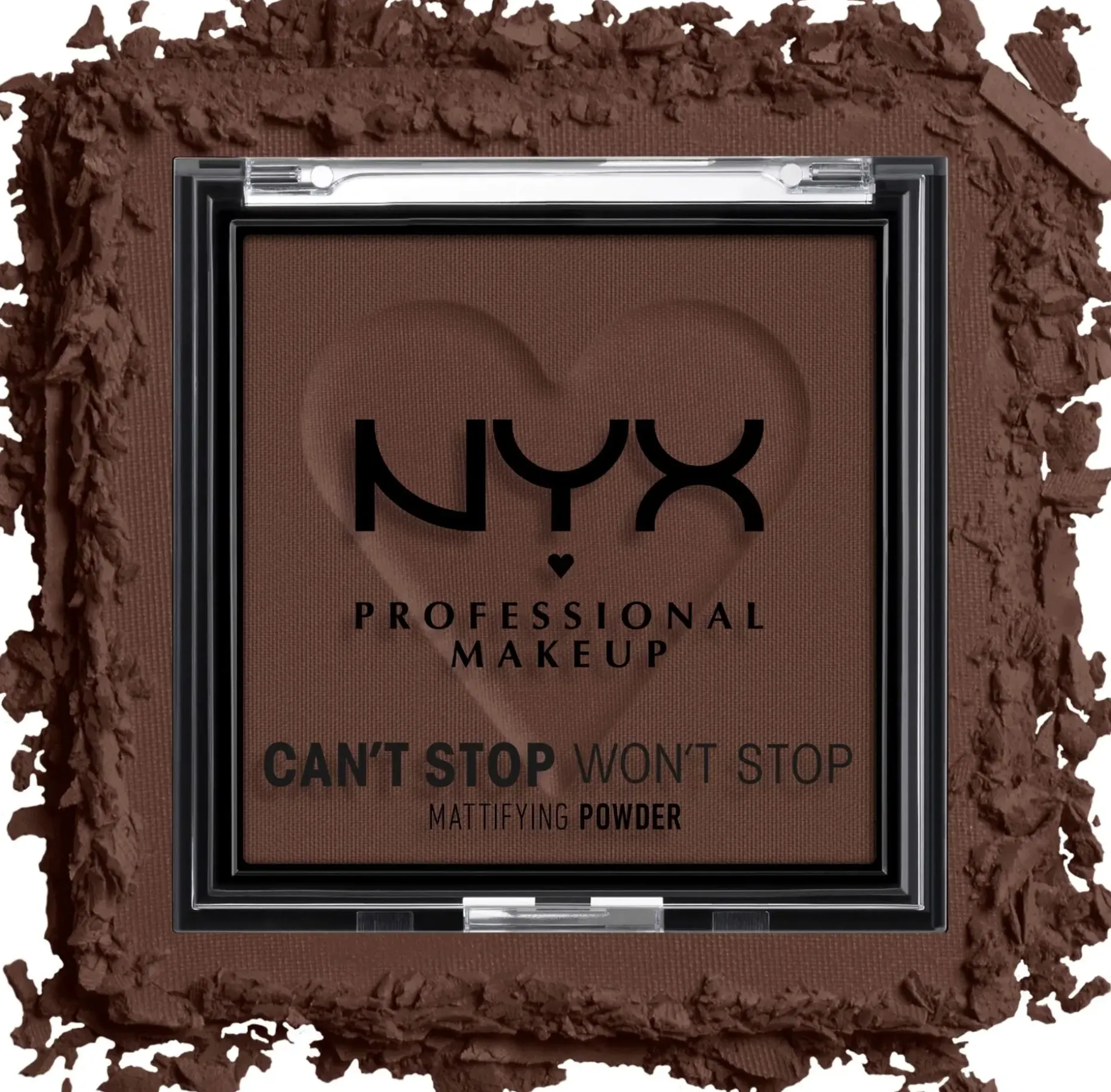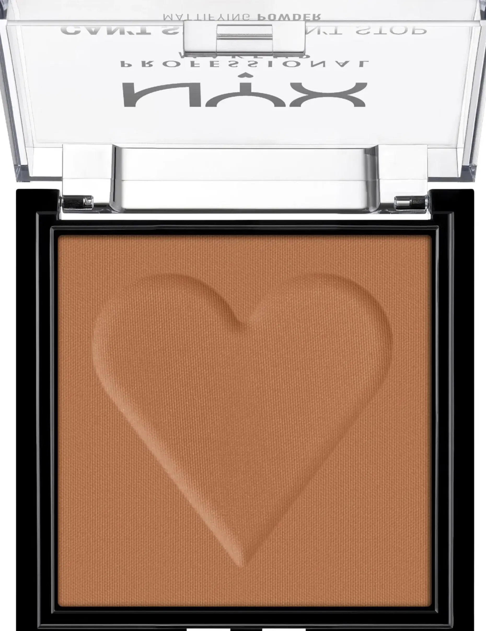 NYX Professional Makeup Can’t Stop Won’t Stop Mattifying Powder -puuteri antaa iholle välittömästi mattapintaisen lopputuloksen ja hillitsee ihon kiiltoa ja rasvaisuutta. ”Kevyt, vegaaninen koostumus* antaa iholle tasaisen, matan lopputuloksen näyttämättä kuivalta, kakkumaiselta tai tunkkaiselta. *Ei sisällä eläinperäisiä ainesosia tai sivutuotteita.
