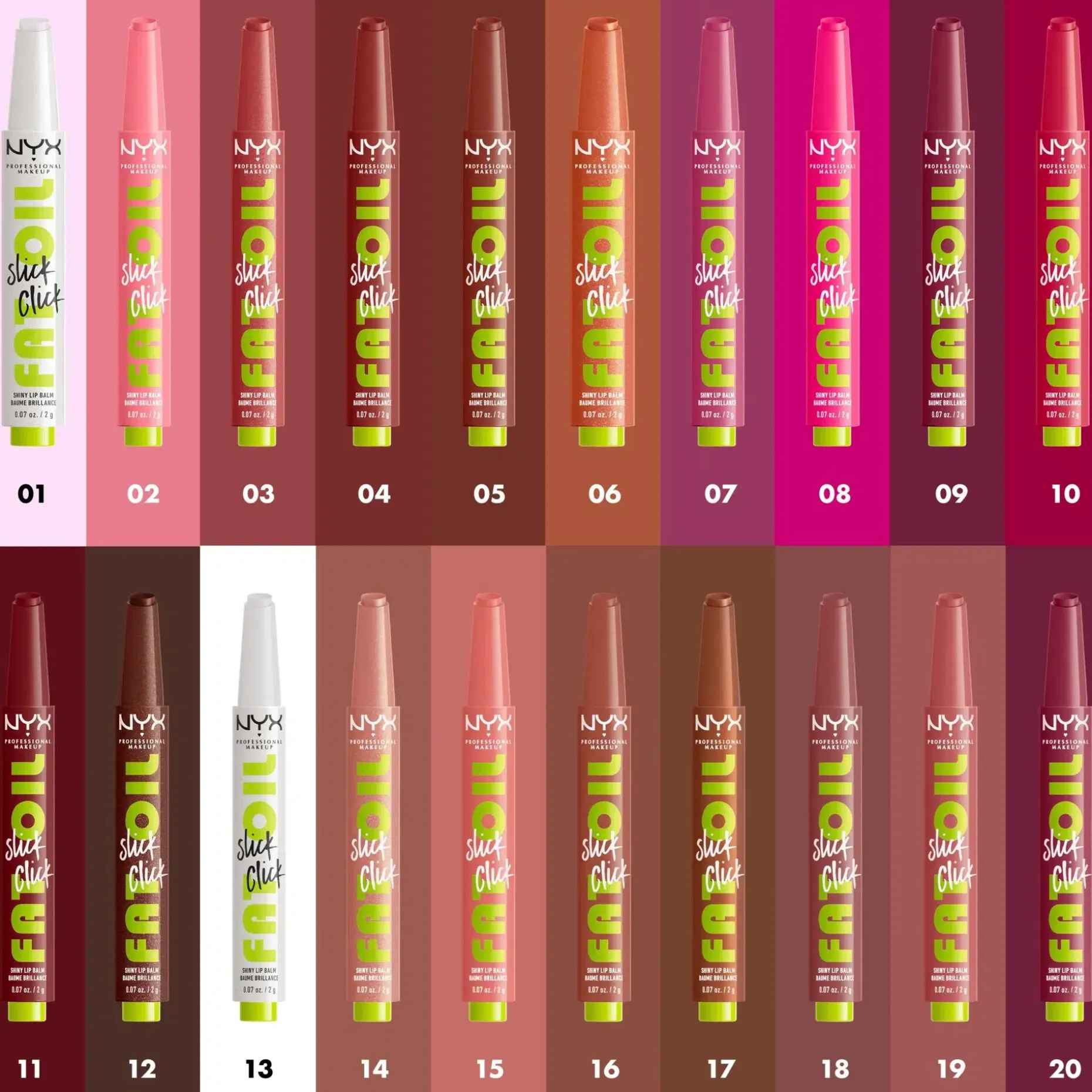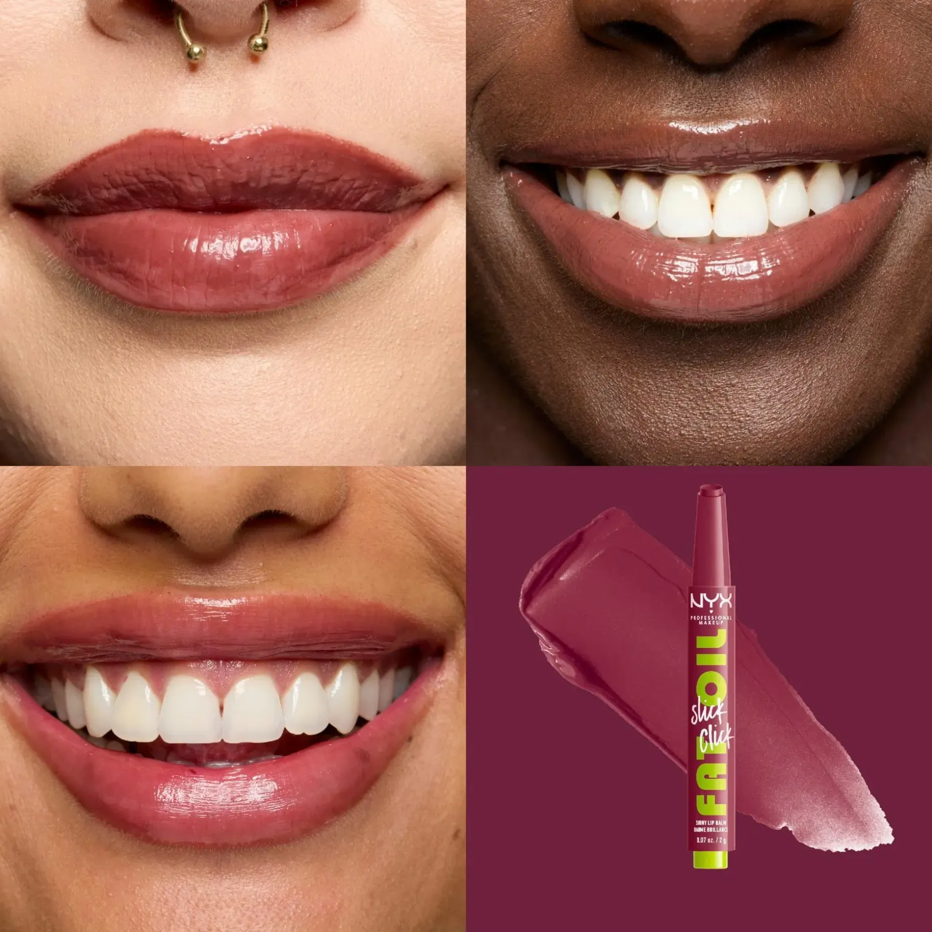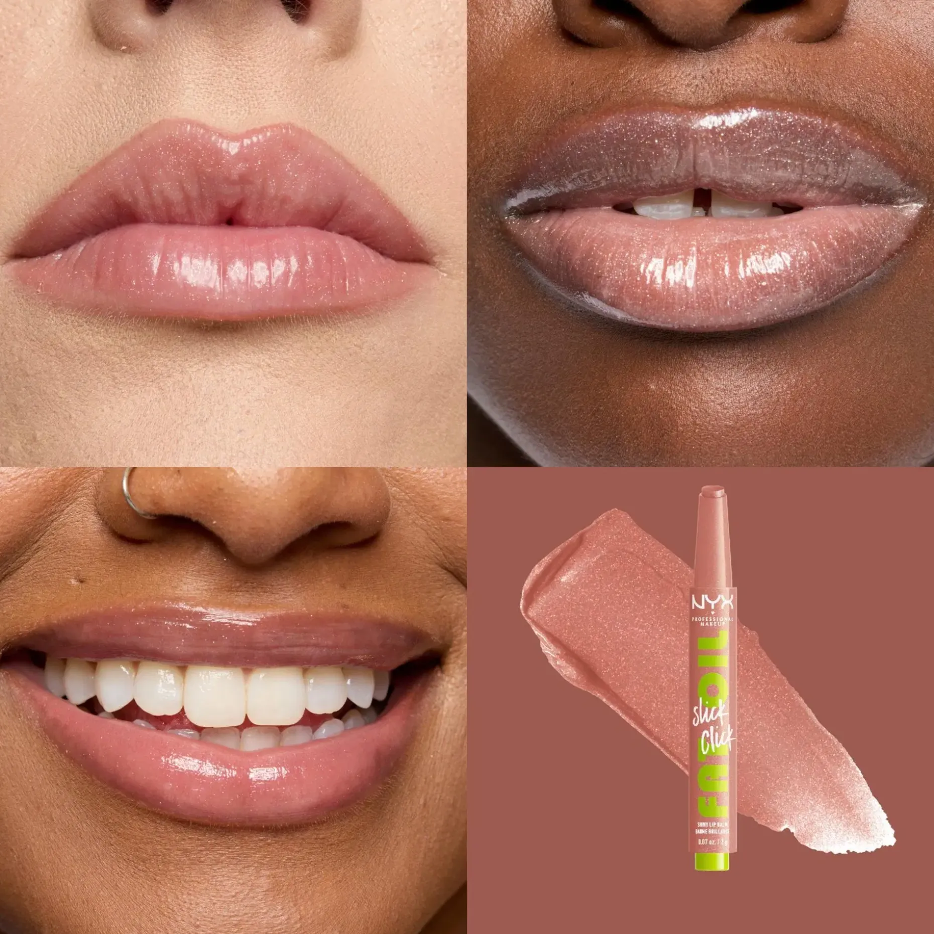 Pehmeät huulet vain yhdellä klikkauksella. NYX Professional Makeup Fat Oil Slick Click sävyttävä huulivoide annostelee juuri oikean määrän tuotetta yhdellä klikkauksella. Vegaaninen avokado-, lakka- ja vadelmaöljyä sisältävä koostumus* hoitaa huuliasi tehokkaasti. • 12 tuntia kosteutta ja miellyttävää hoitoa koko päivän • Koostumus sisältää öljyjä ja erittäin kevyitä pigmenttejä ja se antaa kauniin hillityn värin • Erittäin kiiltävä lopputulos tahmaamatta • Löydä suosikkisi upeasta värivalikoimasta • Kaikille ihon sävyille sopivia sävyjä • Vegaaninen koostumus* *Ei sisällä eläinperäisiä ainesosia.