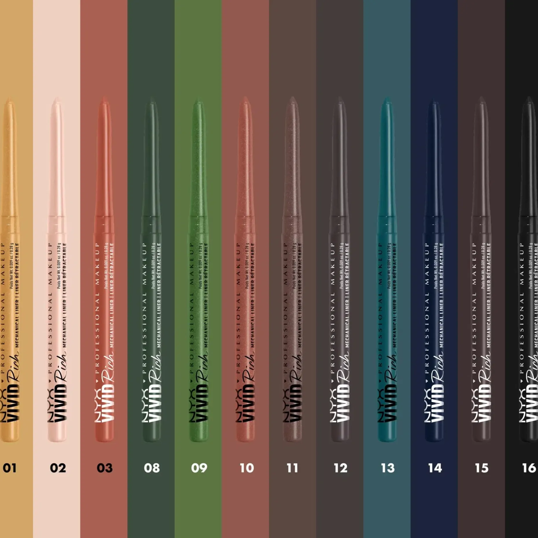 NYX Professional Makeup Vivid Rich Eye mekaaniset silmänrajauskynät täyteläisissä jalokivien inspiroimissa sävyissä, kuten Spicy Pearl, Amber Stunner ja Aquamarine Dream, antavat upean ja eloisan lookin matoilla, kimalteisilla ja metallisilla lopputuloksilla.