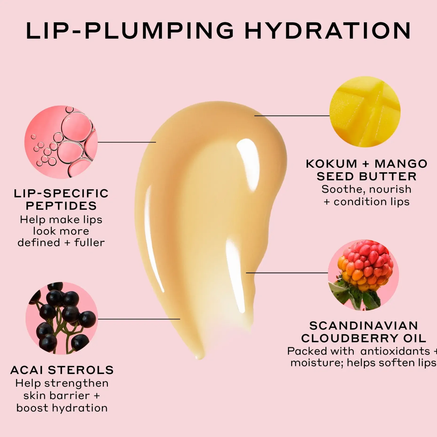 Tämä erittäin ravitseva huulihoito antaa pitkäkestoista, täyteläistä kosteutusta ja kliinisesti täyteläisemmät huulet viikossa – ilman täyteaineita. Huulille suunnattujen peptidien, kokum- ja mangonsiemenvoin sekä lakkaöljyn voimin se silottaa juonteita ja auttaa palauttamaan huulten luonnollisen volyymin ajan myötä. Kiiltävä, tahmaamaton läpikuultava koostumus levittyy helposti ja on saatavilla useissa houkuttelevissa tuoksuissa ja sävyissä.