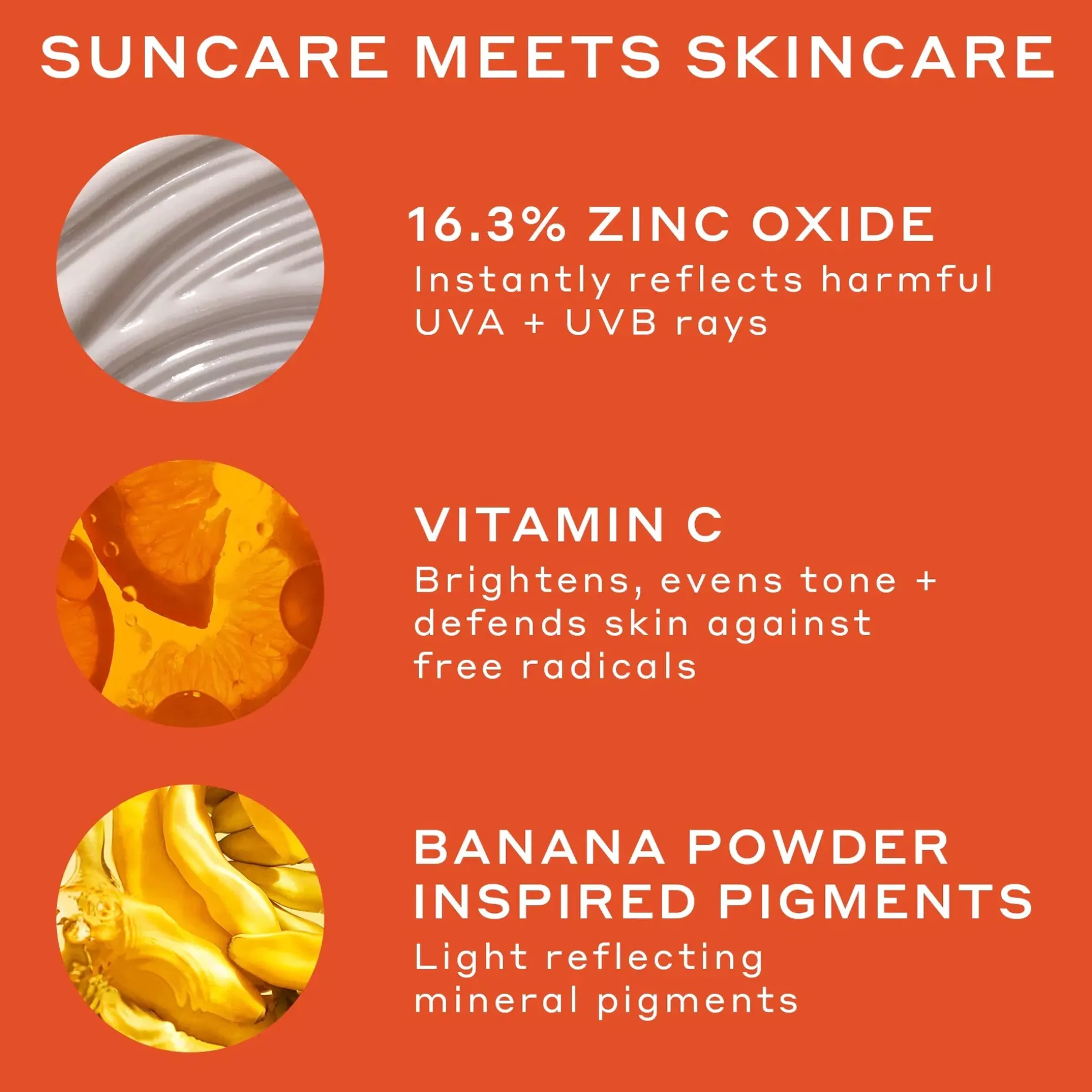 AQUA/WATER/EAU, ZINC OXIDE, CAPRYLIC/CAPRIC TRIGLYCERIDE, BUTYLOCTYL SALICYLATE, PROPANEDIOL, NIACINAMIDE, ALOE BARBADENSIS LEAF JUICE, 1,2-HEXANEDIOL, SODIUM ACRYLATE/SODIUM ACRYLOYLDIMETHYL TAURATE COPOLYMER, SQUALANE, TETRAHEXYLDECYL ASCORBATE, CITRUS AURANTIUM DULCIS (ORANGE) CALLUS CULTURE EXTRACT, CITRUS AURANTIUM DULCIS (ORANGE) PEEL EXTRACT, LACTOBACILLUS FERMENT, PANTHENOL, TOCOPHEROL, GLUCONOLACTONE, GLYCERIN, JOJOBA ESTERS, HELIANTHUS ANNUUS (SUNFLOWER) SEED OIL, GLYCERYL STEARATE, CETYL ALCOHOL, CALCIUM GLUCONATE, GLYCOL STEARATE, LECITHIN, SORBITAN OLEATE, TAPIOCA STARCH, HYDROXYACETOPHENONE, ISOSTEARIC ACID, POLYGLYCERYL-3 POLYRICINOLEATE, POLYHYDROXYSTEARIC ACID, ISOHEXADECANE, XANTHAN GUM, CANOLA OIL, POLYSORBATE 80, POTASSIUM SORBATE, SODIUM BENZOATE, CITRIC ACID, OCTYLDODECANOL, LEUCONOSTOC/RADISH ROOT FERMENT FILTRATE, PARFUM/FRAGRANCE, CITRAL, LIMONENE, LINALOOL, IRON OXIDES (CI 77491, CI 77492), TITANIUM DIOXIDE (CI 77891).