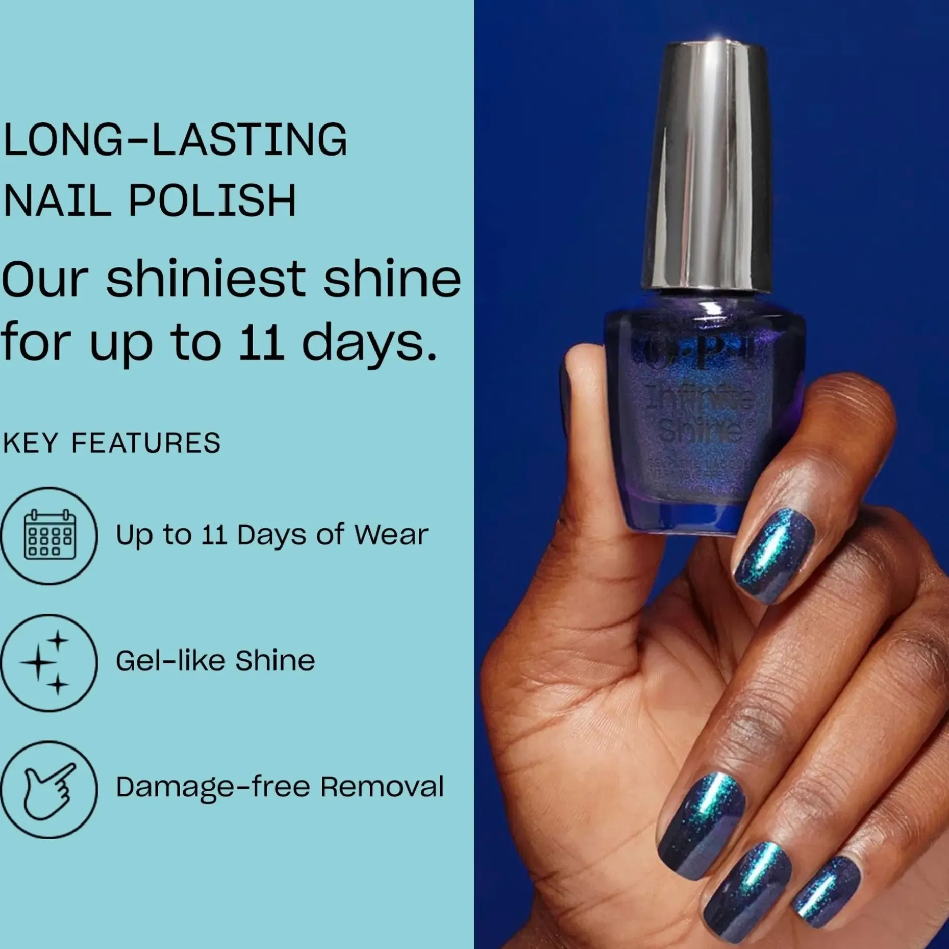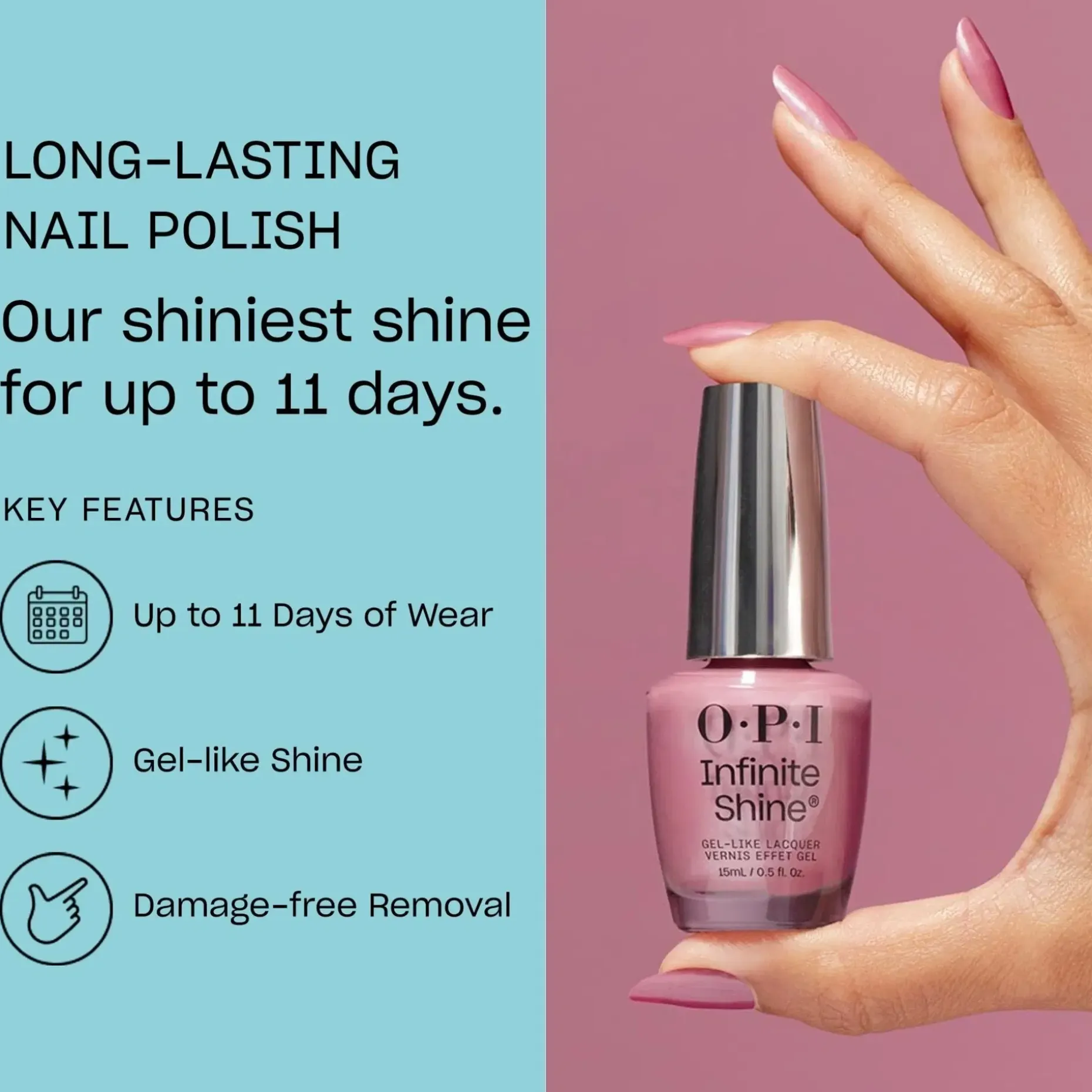 Locks like gel, unlocks like lacquer. OPI esittelee uuden mullistavan Infinite Shine -koostumuksen, jonka teknologia antaa kiiltoa, peittävyyttä ja pitkäaikaista kestoa jopa 11 päiväksi. Geelimäinen koostumus antaa sileän ja tasaisen peittävyyden ilman raitoja tai kuplia. Helppo poistaa asetonilla nopeasti ja vahingoittamatta kynttä. Niin hyvä, että sen luulisi olevan geelilakka. Infinite Shine yhdistää kaiken, mitä rakastat geeli- ja kynsilakassa.