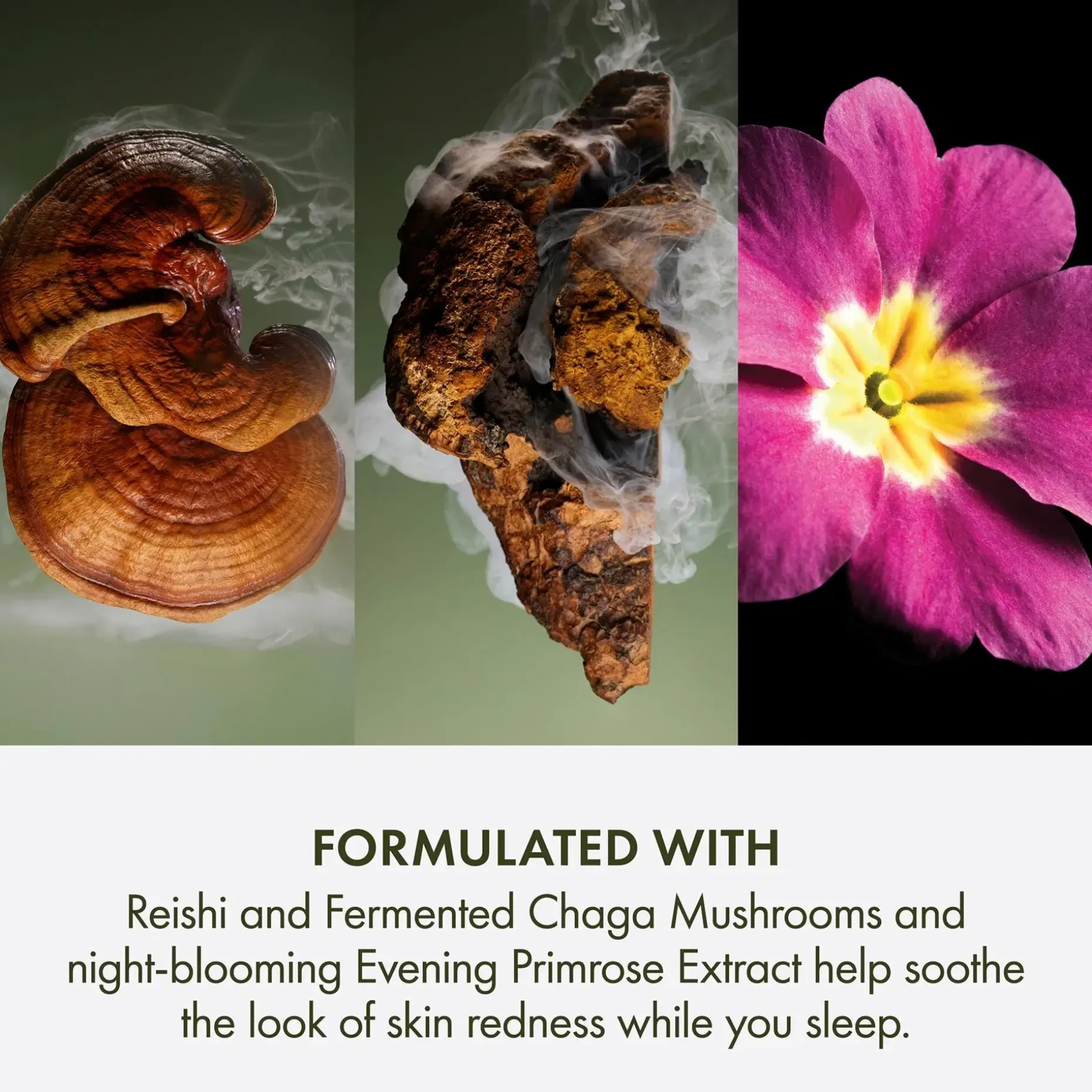 Voiteen runsas, samettinen koostumus imeytyy helposti ja kosteuttaa, korjaa ja palauttaa ihon suojakerrosta syvältä yön aikana – jotta heräät säteilevältä ja uudistuneelta tuntuvaan ihoon. Reishi, fermentoitu chagasieni ja iltahelokkiuute auttavat rauhoittamaan ihoa näkyvästi ja vähentämään ihoärsytystä, jolloin iho näyttää täyteläisemmältä.