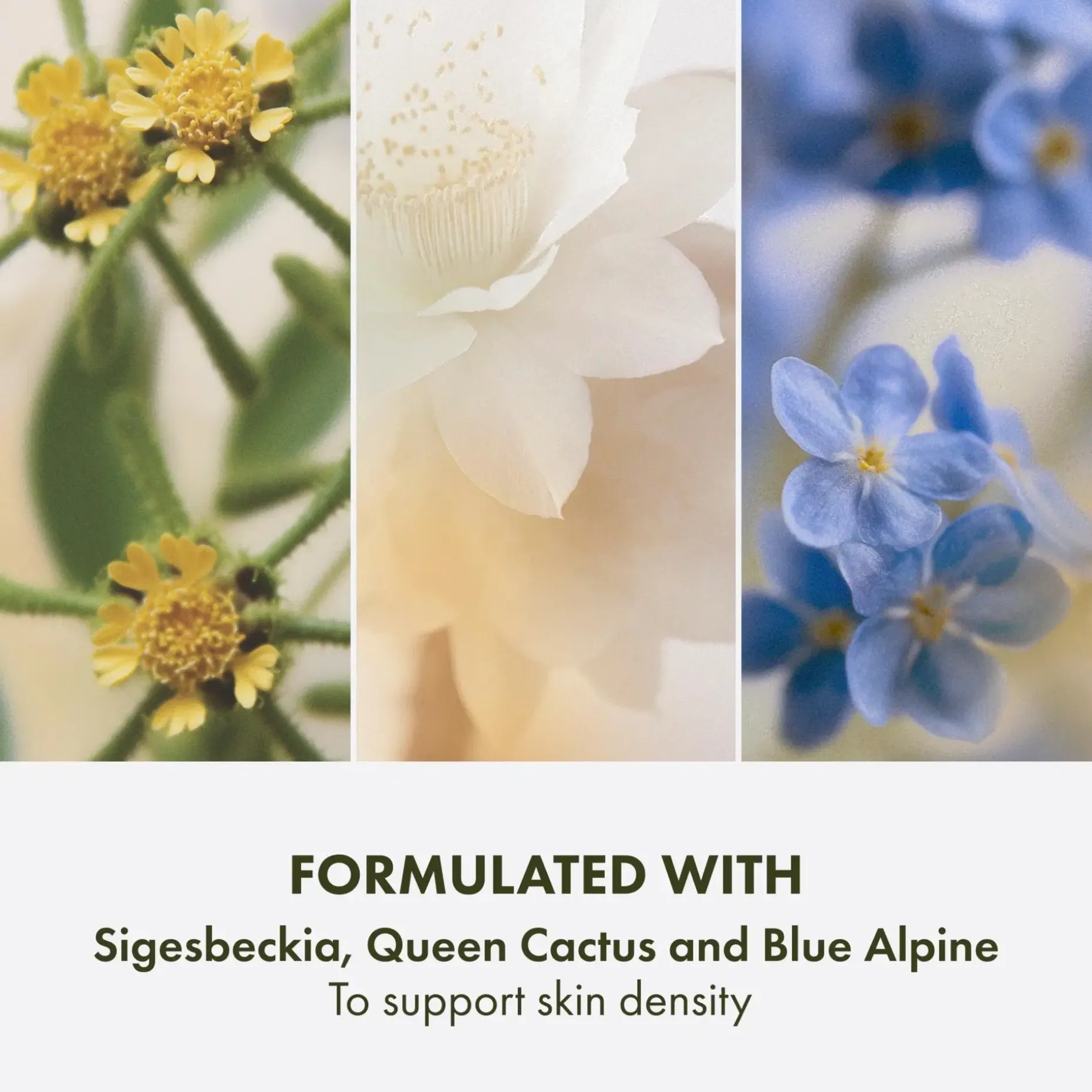 Sinivuokolla, Queen Cactus -kasvilla, sigesbeckialla ja peptideillä rikastettu ravitseva koostumus kosteuttaa ihoa ikääntymistä ehkäisevästi ja auttaa vahvistamaan ihon luonnollista kollageenia ja fibronektiinia (tärkeitä nuorekkaan ihon komponentteja) häivyttäen näkyviä ikääntymisen merkkejä.