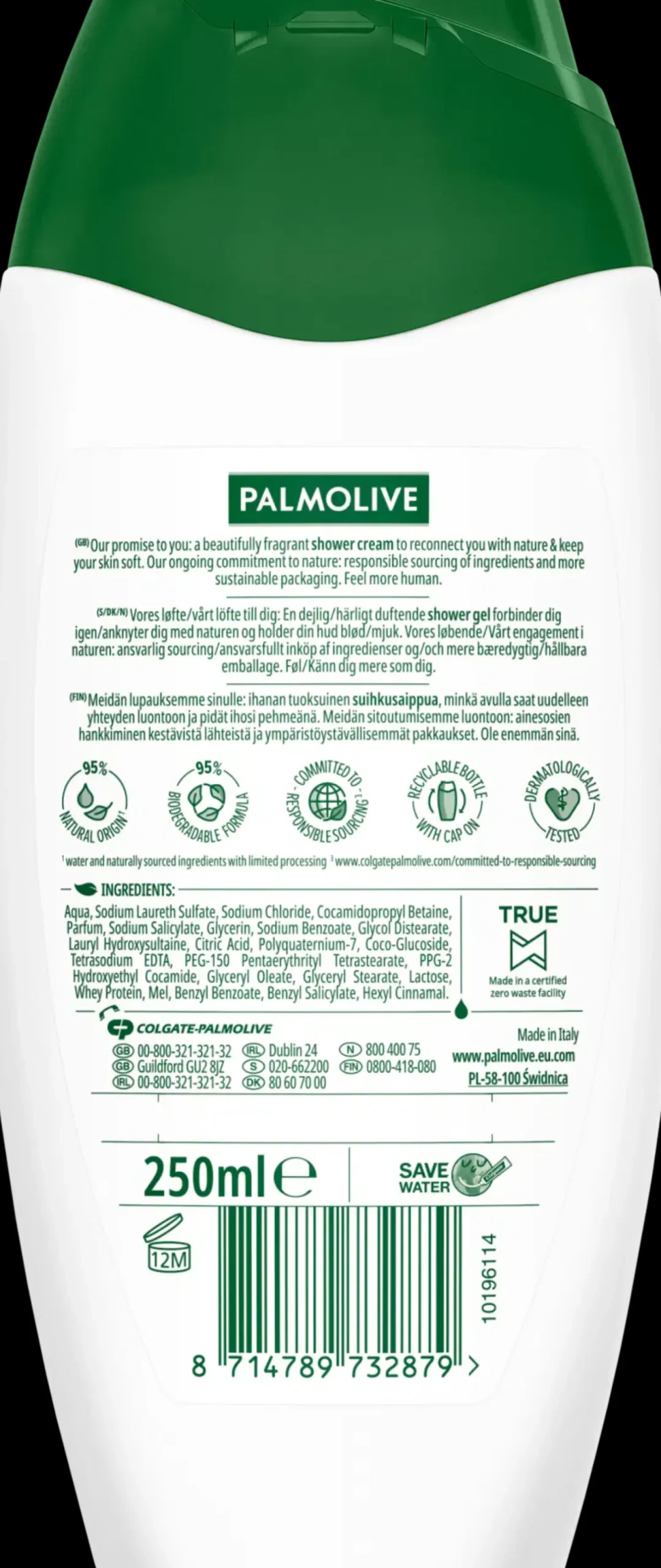 Palmolive Naturals Milk & Honey -koostumus sisältää kasvipohjaista maitoa. Se on valmistettu 95% luonnollisista ainesosista** ja on 98% biohajoava. Kierrätettävä pullo ja korkki, sekä dermatologisesti testattu koostumus.