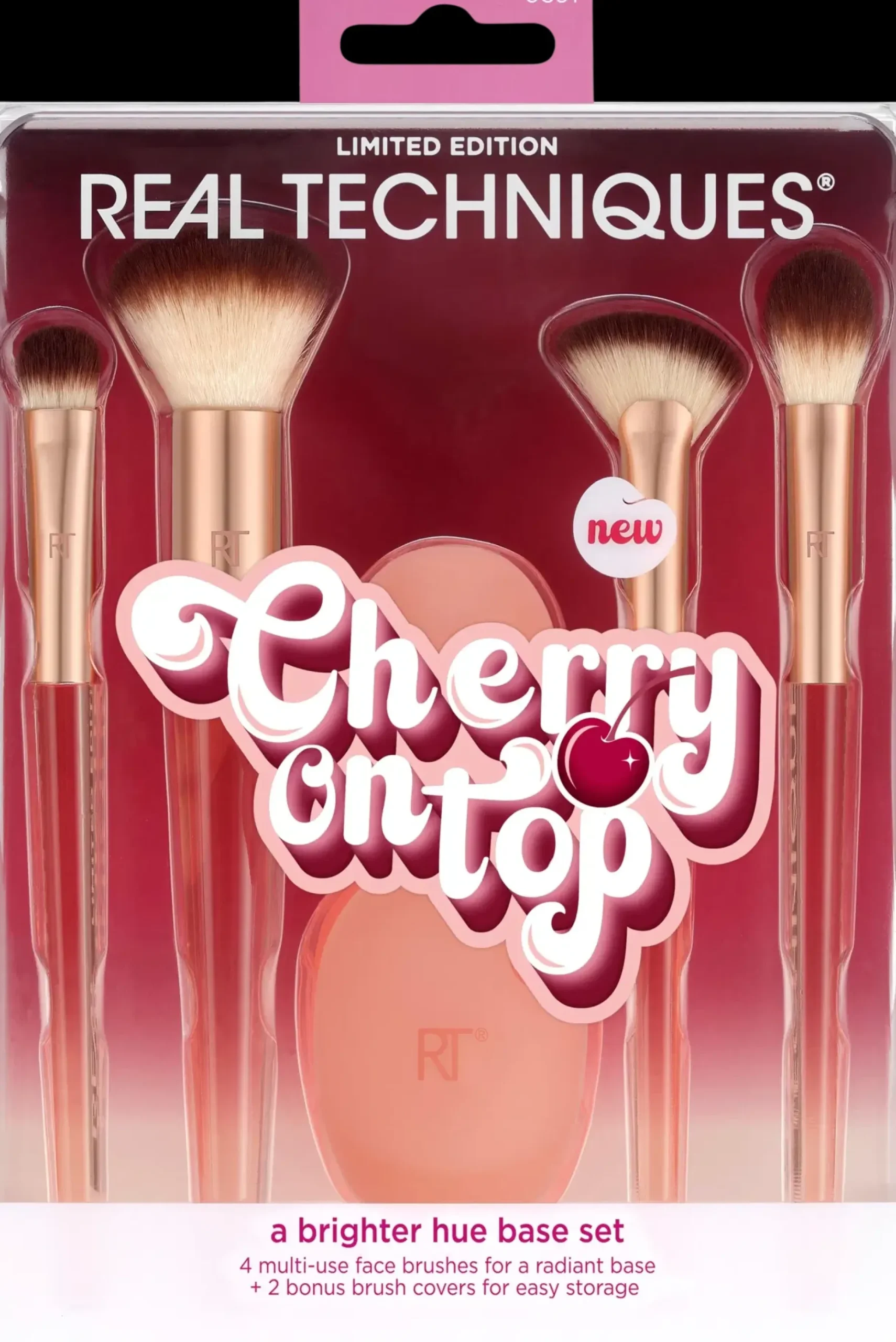 Real Techniques A Brighter Hue Base Set on limited edition -meikkivälinesetti, joka sisältää 4 monikäyttöistä meikkisivellintä, joilla voit peittää, tasoittaa ja kirkastaa meikkipohjasi luonnollisen hehkun saavuttamiseksi. Lisäksi mukana tulee 2 ylimääräistä siveltimenpään suojusta helppoa ja hygieenistä säilytystä varten. Jokainen meikkisivellin sopii käytettäväksi nestemäisten, voidemaisten ja puuterimaisten tuotteiden, kuten meikkivoiteen, peitevoiteen, viimeistelypuuterin, korostuspuuterin ja muiden tuotteiden kanssa. Kokeile myös muita tuotteita rajoitetun erän Cherry On Top -kokoelmasta – sillä jokainen meikkilook ansaitsee kruununsa. 100% eläinkokeeton.