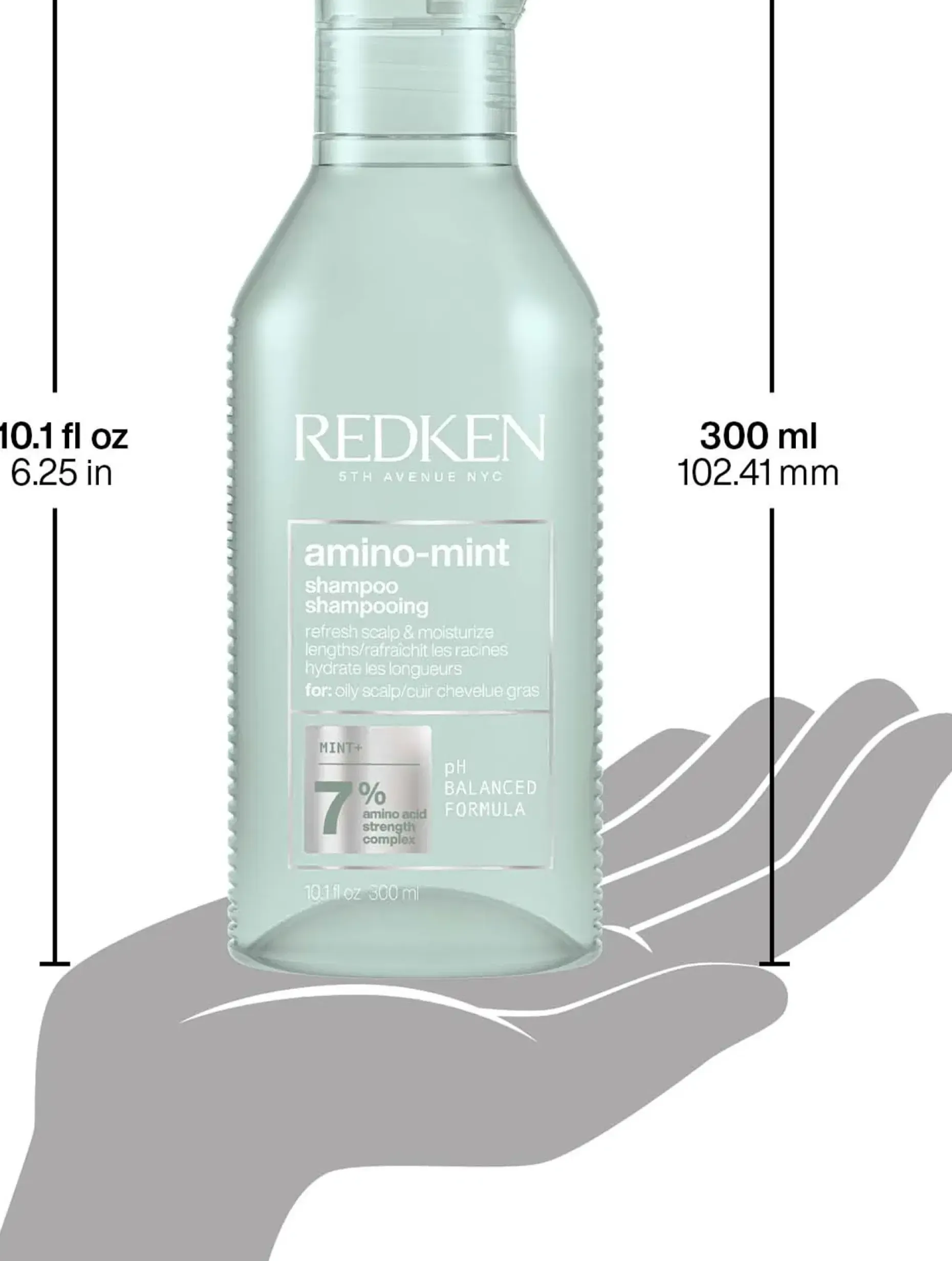 Redkenin Amino Mint Shampoo taistelee rasvoittuvaa hiuspohjaa vastaan ja jättää hiuspohjan ja hiukset puhtaan ja virkistetyn tuntuisiksi. Sisältää minttua ja vahvistavan aminohappoyhdisteen, joka auttaa poistamaan rasvaisuutta hiuspohjasta ja kosteuttamaan pituuksia. Virkistää tyveä ja jättää sen puhtaannäköiseksi. Tuote jättää hiuspohjaan viilentyneen tunteen ja tasapainottaa hiusten pH:ta. Sopii kaikille hiustyypeille ja tekstruureille.