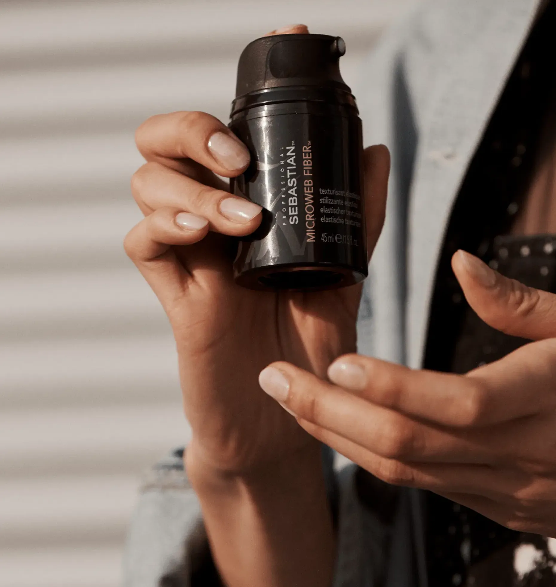 Levitä tasaisesti Sebastian Microweb Fiber -muotoiluainetta kämmeniin. Hiero kuidut kuiviin hiuksiin saadeaksesi erotellun, joustavan rakenteen ja uudelleenmuotoiltavan liikkeen. Puristele, painele tai kierrä saadaksesi lisää rakennetta.