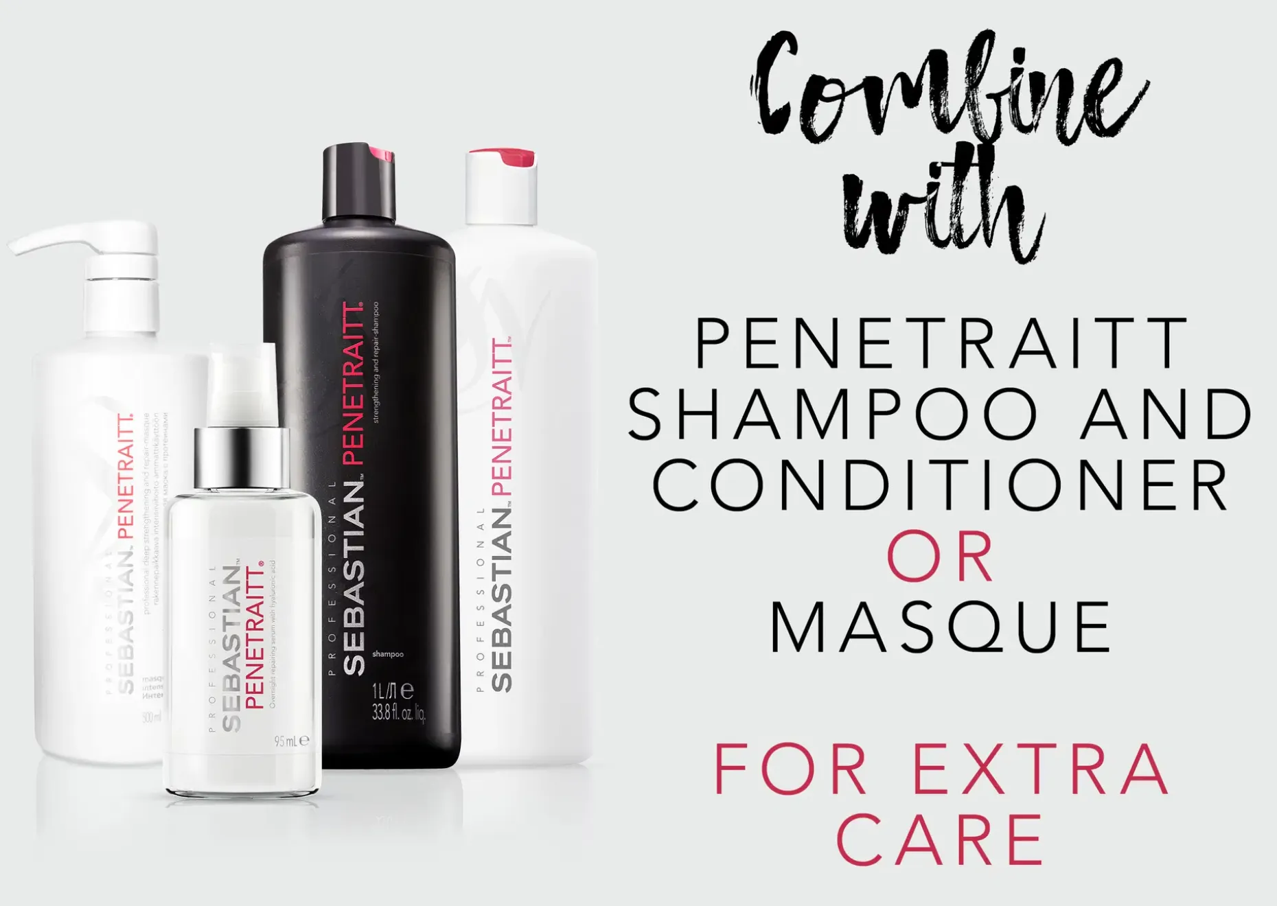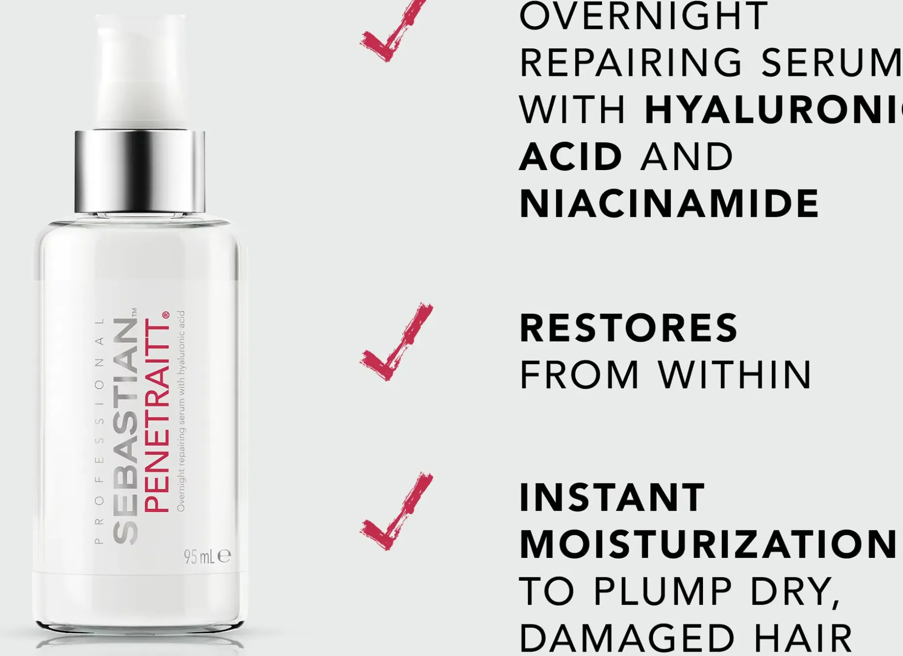 PENETRAITT overnight repairing serum tarjoaa välitöntä kosteutusta kuiville ja vaurioituneille hiuksille. Hiukset näyttävät ja tuntuvat pehmeiltä ja elpyneiltä. Helpottaa hiusten muotoilua seuraavana aamuna. Sisältää hyaluronihappoa sekä niasiiniamidia, jotka auttavat korjaamaan hiuksiasi nukkuessasi, jotta hiukset näyttävät ja tuntuvat pehmeiltä, sileiltä, uudistuneilta ja valmiina loputtomaan muotoiluun.