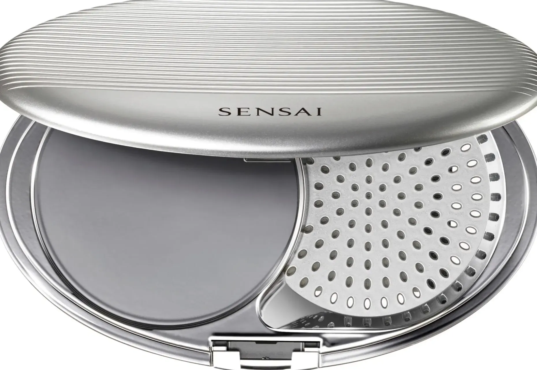 Kaunis, tukeva, muovinen rasia meikkipuuterille, jossa peili. Mukana tekstiilisuoja rasialle.