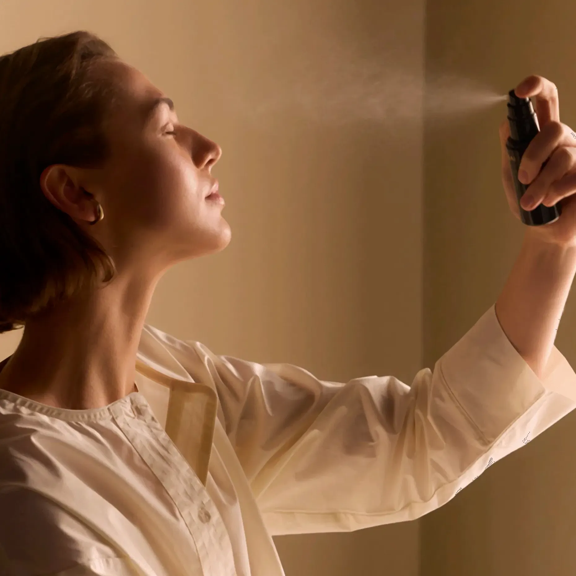 Som avslutning på makeupen ska du hålla flaskan ca 20 cm från ansiktet, blunda och spraya.