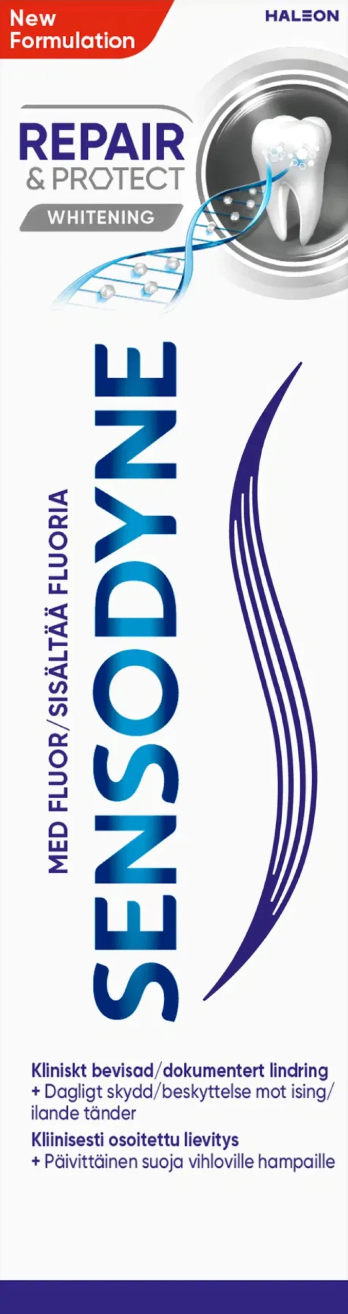 Päivittäiseen käyttöön tarkoitettu Sensodyne Repair & Protect Deep Repair Whitening -hammastahna korjaa ja suojaa hampaiden vihlovia alueita kahdesti päivässä käytettynä. Ainutlaatuinen NovaMin-aineosa lievittää kliinisesti osoitetusti vihlontaa, sillä se muodostaa hampaiden vihlovien alueiden päälle suojaavan kerroksen. Päivittäiseen käyttöön tarkoitettu Sensodyne Repair & Protect Deep Repair Whitening -hammastahna sisältää hampaita vahvistavaa fluoria. Auttaa palauttamaan hampaiden luonnollista valkoisuutta.
